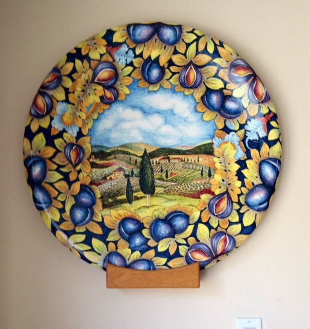 We arrived in the tiny, history-rich town of Certaldo, home of poet and author Giovanni Boccaccio. We rode the funicular to Certaldo Alto where the ceramic shop Artesia Bottega Artigiana immediately beckoned me. I love all Italian ceramics. But one hand-painted dish, in particular, caught my eye. It was a splendidly painted scene of a Tuscan landscape including a farm house, cypress trees and figs, a fruit I happen to love since childhood. It was not only expensive but quite large (28 inches round). How could I ever get it back to the states? After a ridiculous amount of time pondering whether or not to purchase it, I decided to leave the shop empty-handed and regretful as one often is when a missed shopping opportunity passes.