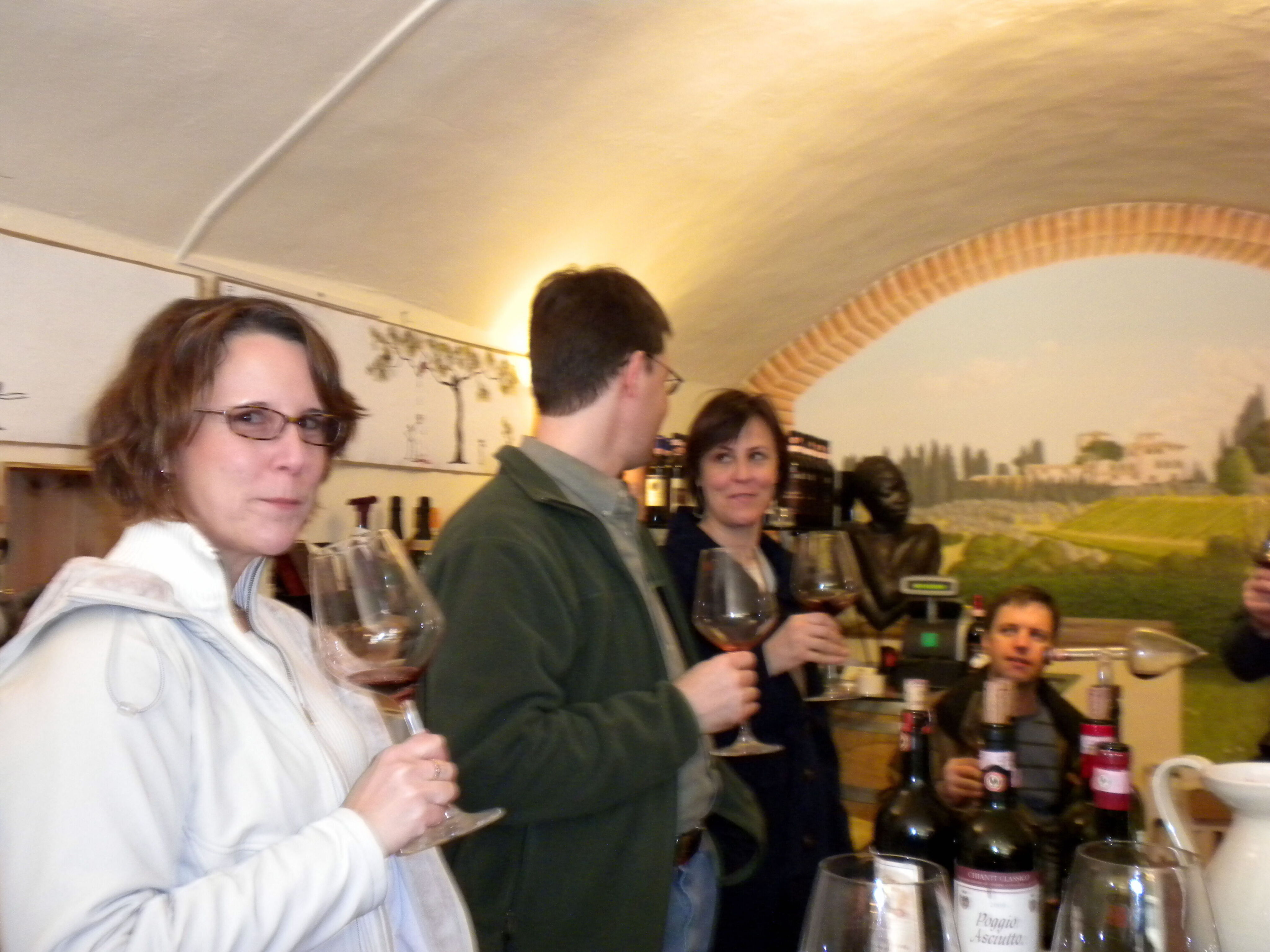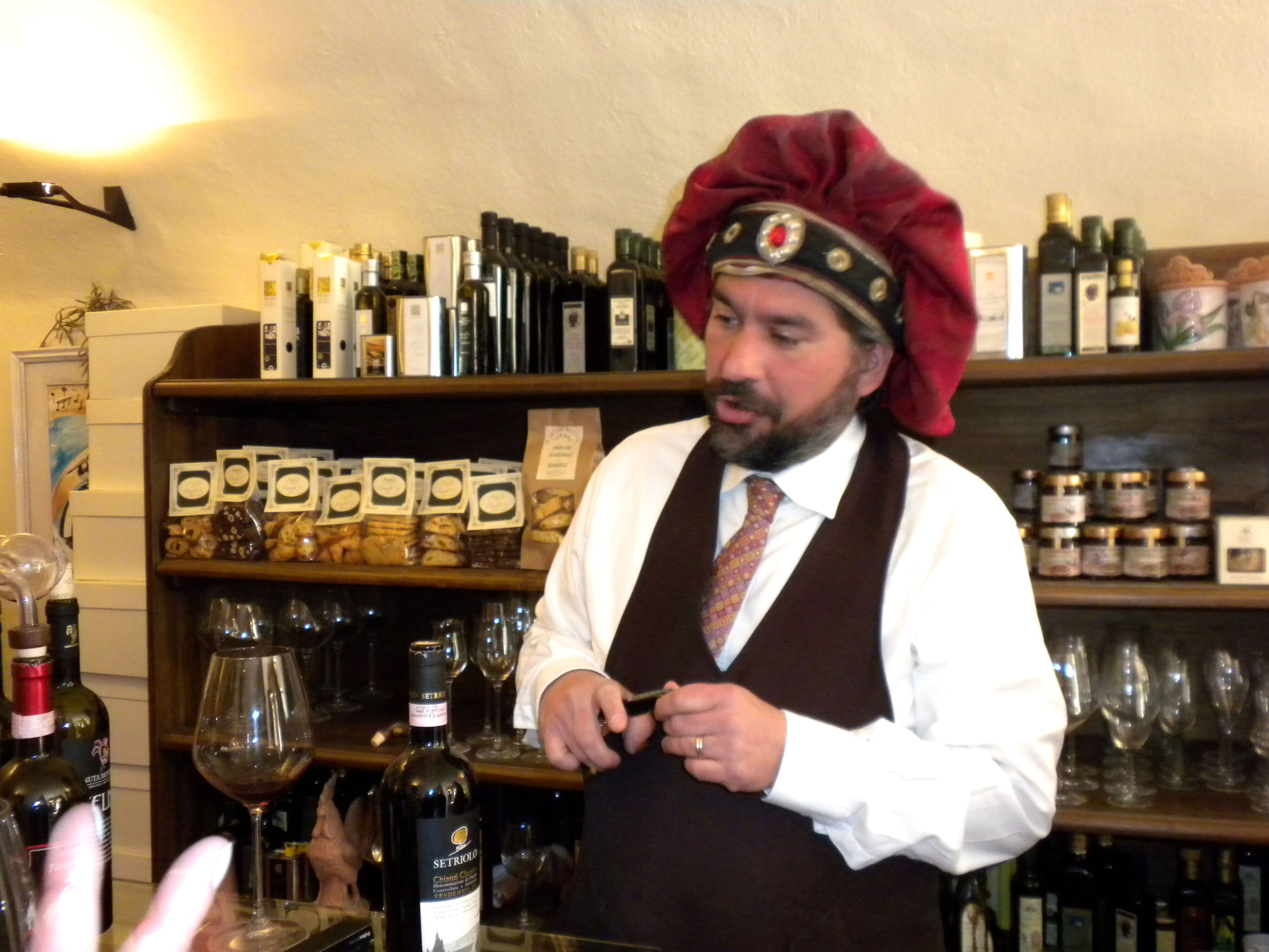 Near the top of the hill we arrived at Accademia del Buon Gusto. The shop owner in his floppy red hat was handsome and charming. He opened bottle after bottle, explaining vineyards and vintages. He was wise and patient and funny. Other customers came and went, yet he seemed to have all the time in the world just for us. The growing array of used glasses sparkled. The eyes of my daughters-in-law sparkled. My sons good-naturedly posed with the boar’s head at the shop entrance.