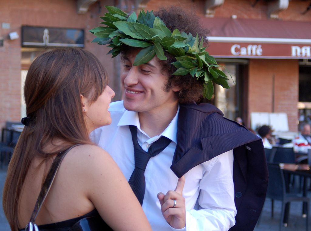 This Handsome couple was in the main arena of Sienna at dusk. They had just married and were celebrating with friends in the square. They seemed unaware of everyone and everything around them they were so madly in love. His smile says it all. Bella!