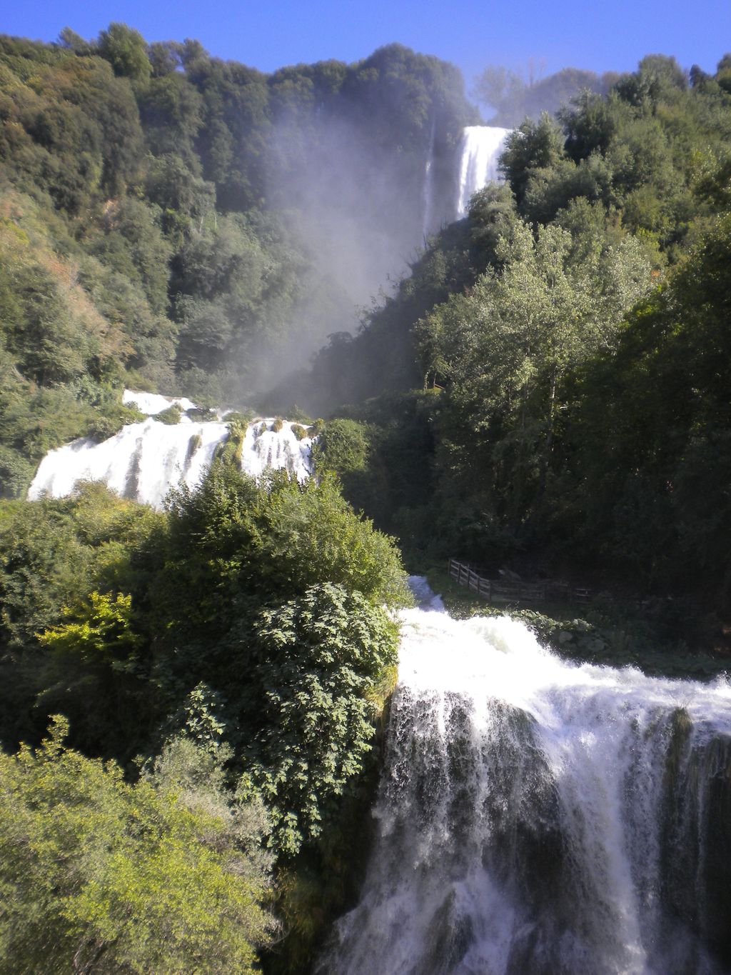 The waterfall Cascata delle Marmore in Umbria, which is 165m, tall. is an awe-inspiring sight. The spray is delightfully cooling on a hot summer´s day, and seen against a clear blue sky, the waterfall is a fantastic man-made achievement.