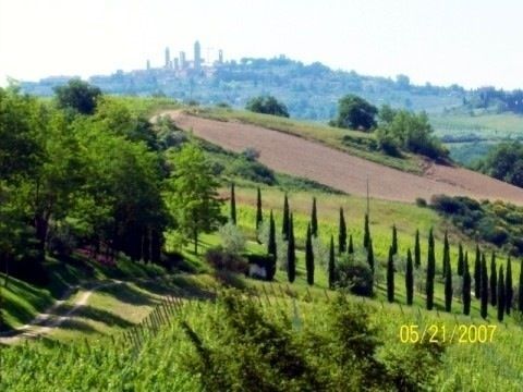 View of San Gimignano in the distance from our room on our honeymoon. San Gimignano has the most remaining towers and makes an excellent backdrop to the beauty of the Tuscan landscape.