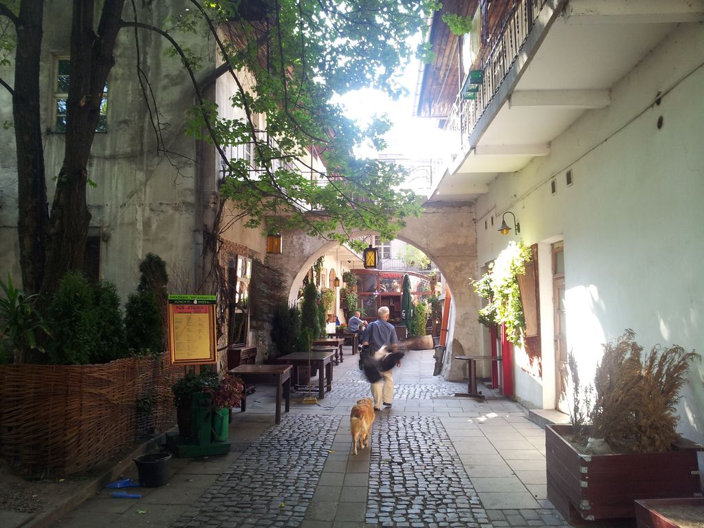 Very romantic alley in the Cracow's Old Town. The Man, the dog and the pigeon(the blury thing in the middle)...