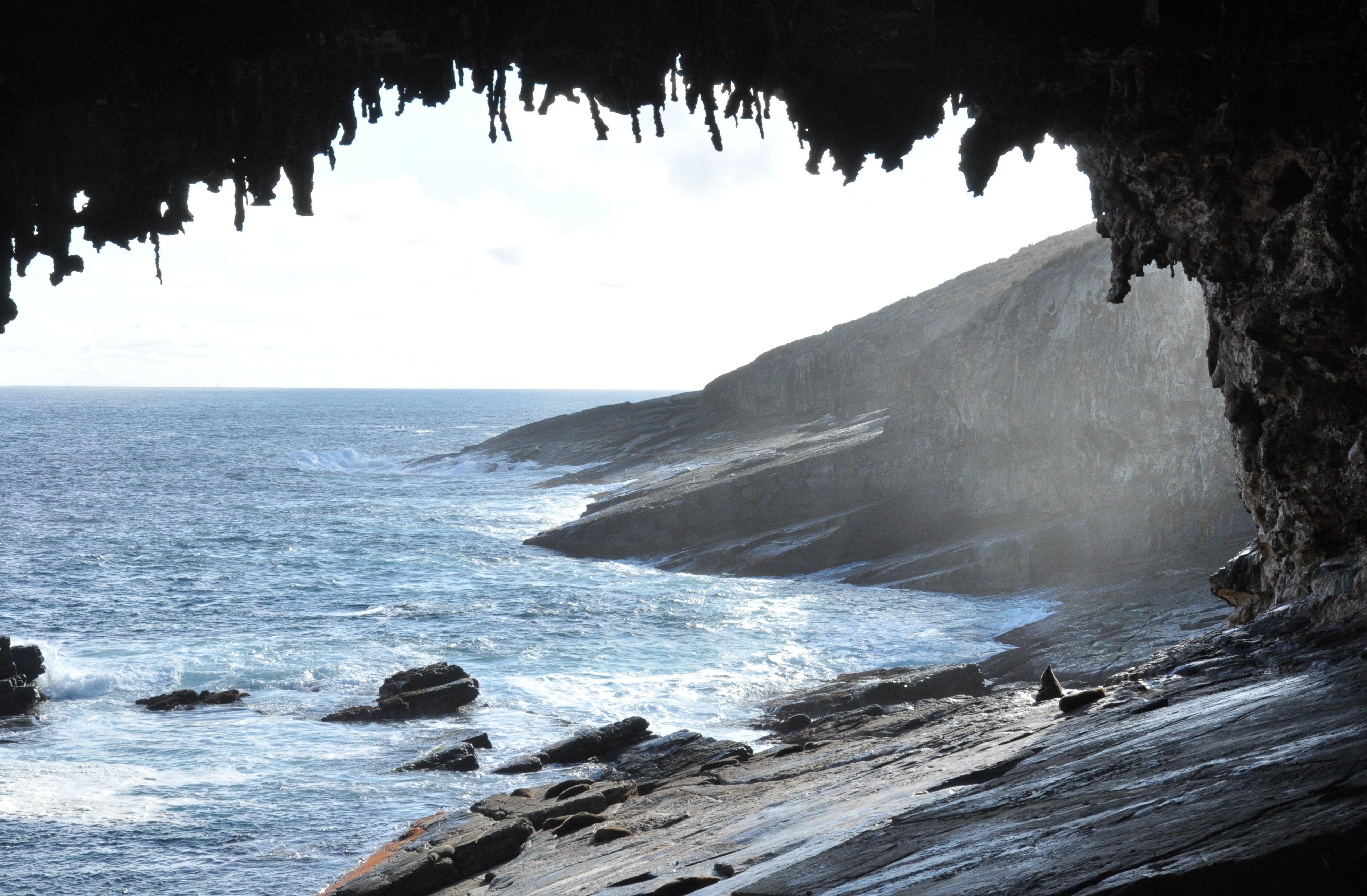 Leoni marini fotografati a Seal Bay dentro un arco di roccia naturale, con il mare leggermente mosso a rendere il paesagio molto pittoresco
