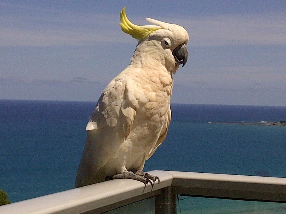 A friendly cockatoo comes to visit! On the porch of the holiday rental we rented in Lorne, Great Ocean Road, Victoria, Australia.