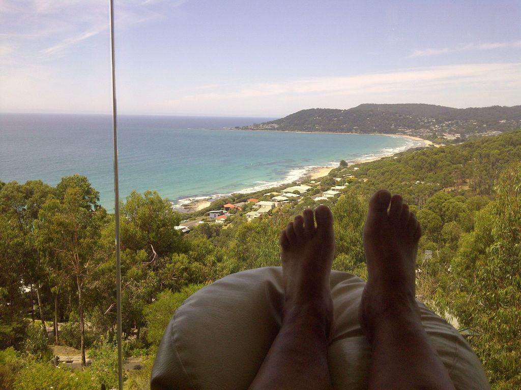 Perfect way to melt-away the stresses and strains of city life! This is the view from the lounge room of a holiday rental we rented in Lorne, Victoria, Australia. The view is along the Great Ocean Road, looking towards Lorne.