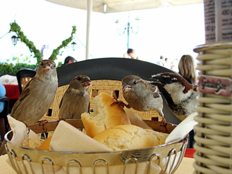 Tame sparrows eating my lunch at St.Marks Square in Venice, one lovely afternoon in May.