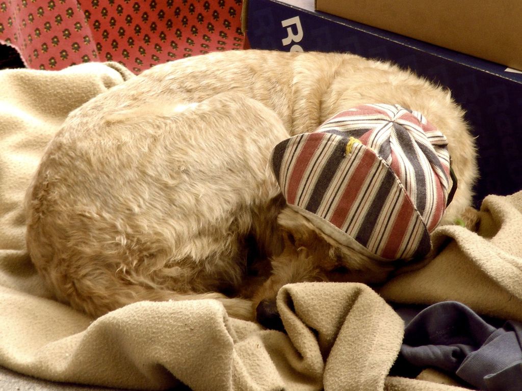 Little french dog sleeping by his owner's market stall in Isle sur la Sorgue, France.