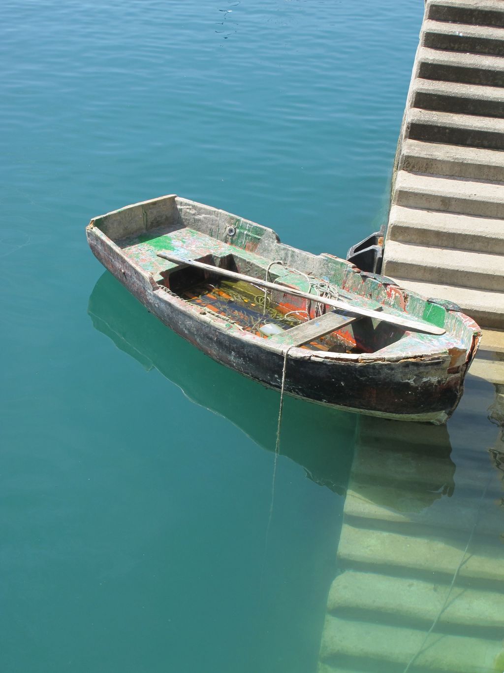 This is a colorful wooden boat floating in a marina in San Sebastian, Spain.