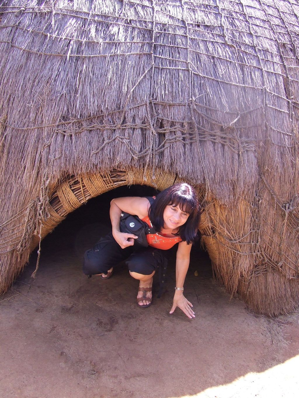 Me crawling out of a Swazi Hut (home) in Swaziland South Africa. We visit the Swazi's culture village in Ezulwini Swaziland in February 2010.