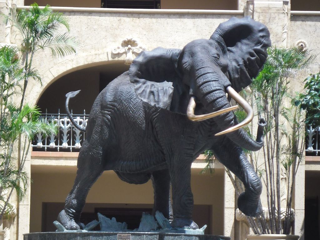 Bronze sculpture of an elephant called Shawu by Danie de Jager. This is at the entrance from the Valley of the Waves to the Palace of the Lost City at Sun City in South Africa and was taken in Feb 2011. This internationally known sculpture is a life size bronze of an African elephant.