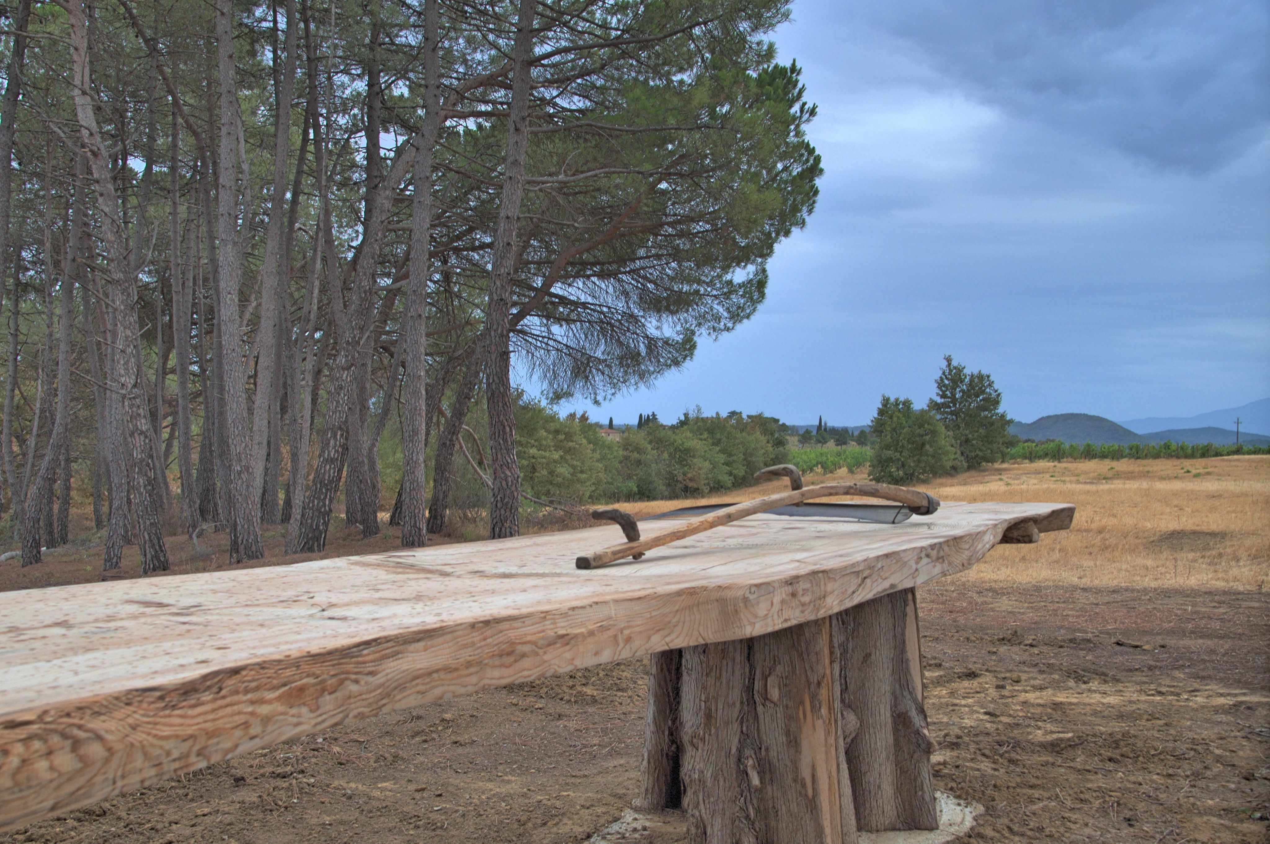 Abseits einer Strasse wurde wohl gerade ein Picknickplatz errichtet. die zurückgelassene Sense auf dem rieseigen Holztisch laäst die Frage Offen wer hier wohl der Hausherr ist.