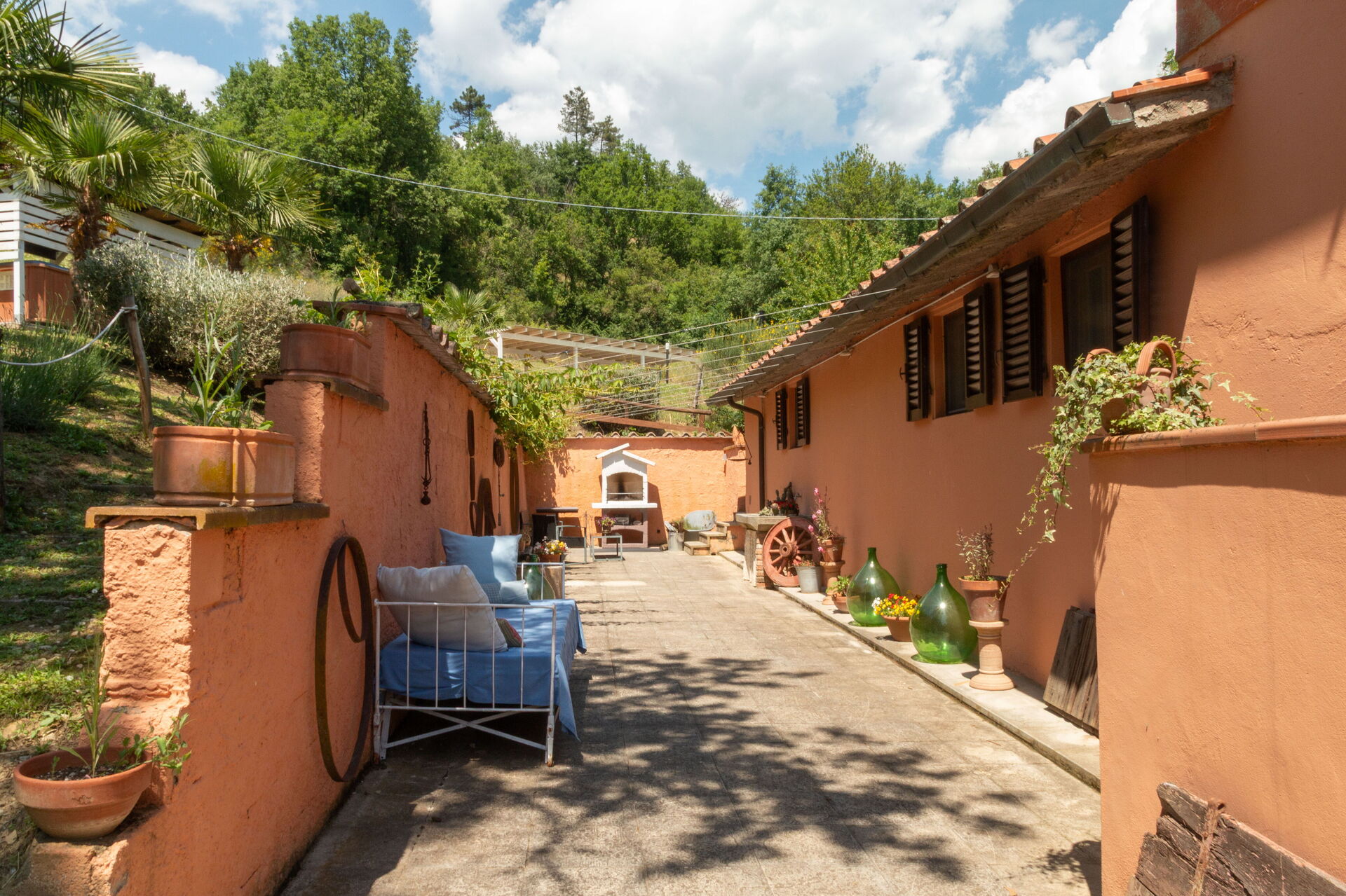 The entire property consists of the Podere of about 8 hectares of fields and oak woods. The access road to the property continues beyond the small bridge to the end of its run to the houses of the ancient Mulino del Doccio.