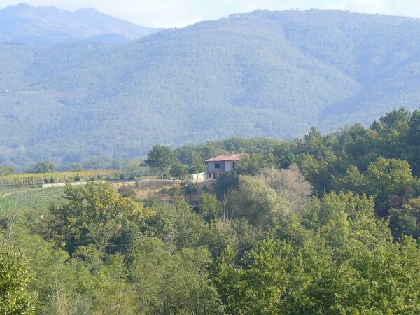 In the interests of "truth in advertising", it should be noted that if your ideal is a plush villa with a panoramic view over the Tuscan countryside, Podere Il Doccio may not be for you. It is a rustic (but nicely remodeled and furnished) old house located about a km down a one-lane gravel road, in a deep valley on a small stream. It has a very nice setting in the midst of a wooded area, adjacent to a small vineyard, and very quiet and peaceful - but no "long" view.