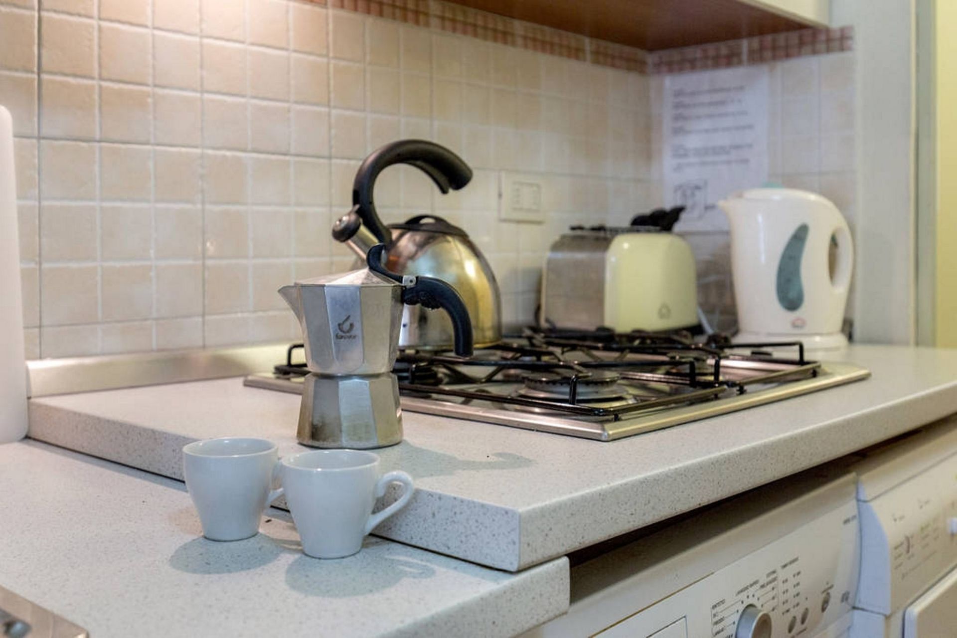 Kitchen + living room: well equipped kitchen, dining table, fridge, freezer, microwave, stove top, toaster, iron, italian coffee machine, american coffee machine, washing machine, sofa bed double (length: 1.9m, width: 1.4m), sofa bed (length: 1.9m, width: 0.8m), WIFI internet, air conditioning.