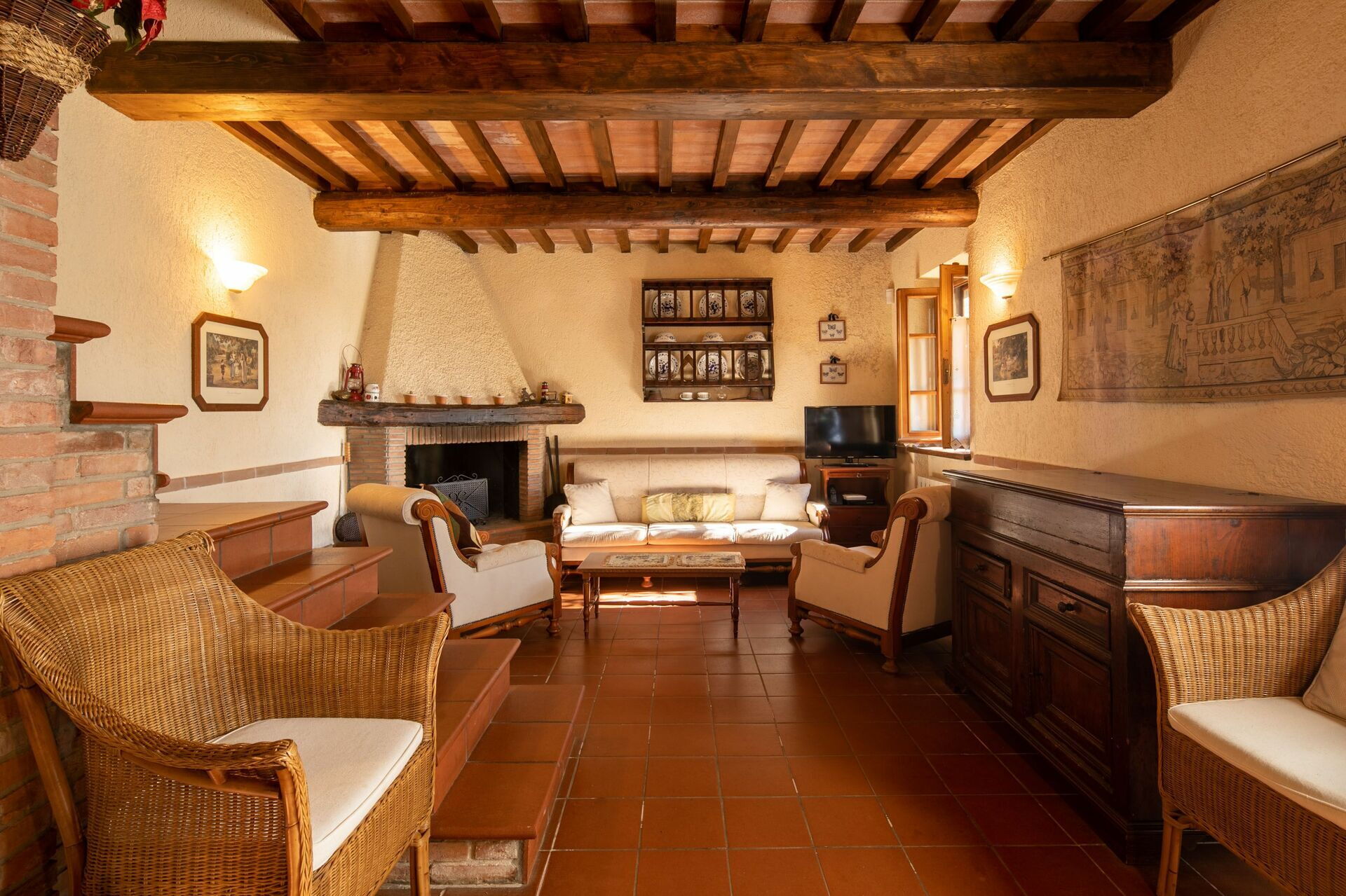 Living room: sofa (people: 2), two armchairs, fireplace, dining table (people: 6), WIFI internet, satellite tv, television.