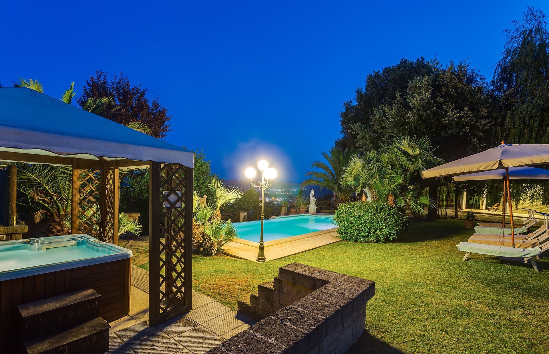The swimming pool has a roman style shape with steps gradually leading down into the water which is slightly salted. The pool has two hydro massage corners, an infinity edge and is particularly beautiful in the evening as its lights change the colour of the water creating a romantic atmosphere. The hot-tub should be reserved in advance.
