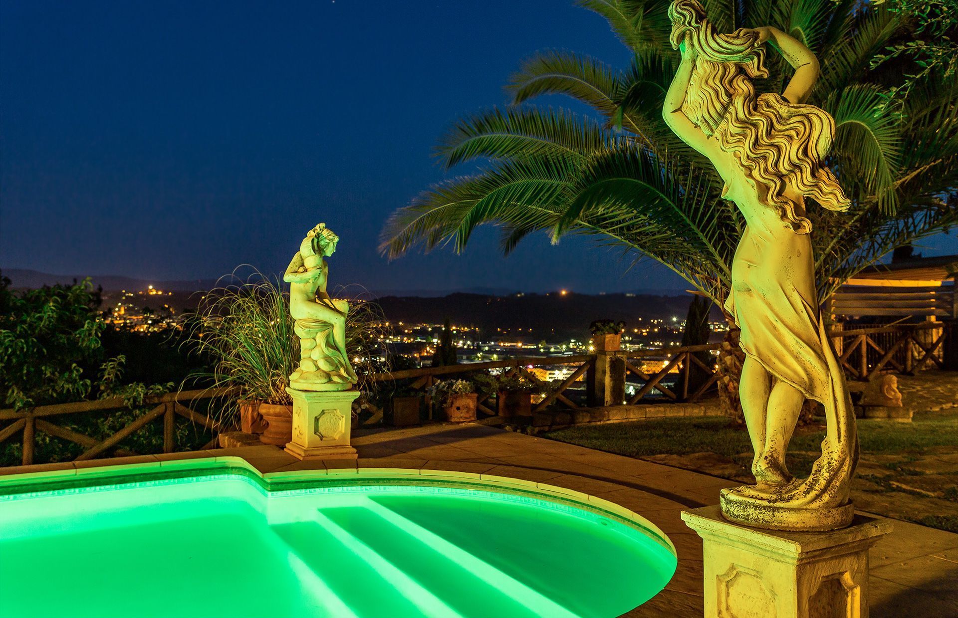 The grounds are gorgeous and include a lawn, infinity pool, hot tub, laundry room, BBQ, outdoor tables and chairs and a breathtaking view of the countryside. Willow trees grace the property, the infinity pool is trimmed with lovely statures, and the playful swing hanging from a tree is inviting, even to adults. The birds will sing you a chorus every morning and throughout the day. In the evenings, you can sip wine while looking at the twinkling lights in the valley below, listen to the splashing fountains, and imagine for a moment that you can stay there forever. You will feel like a local living on a hillside in Tuscany.