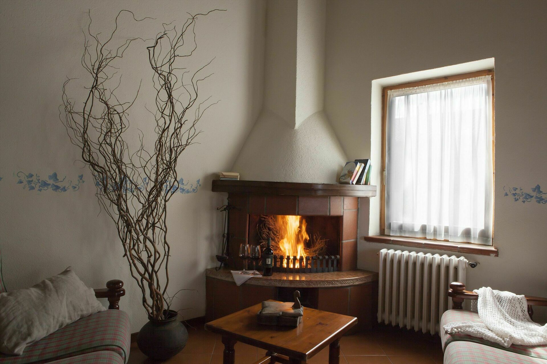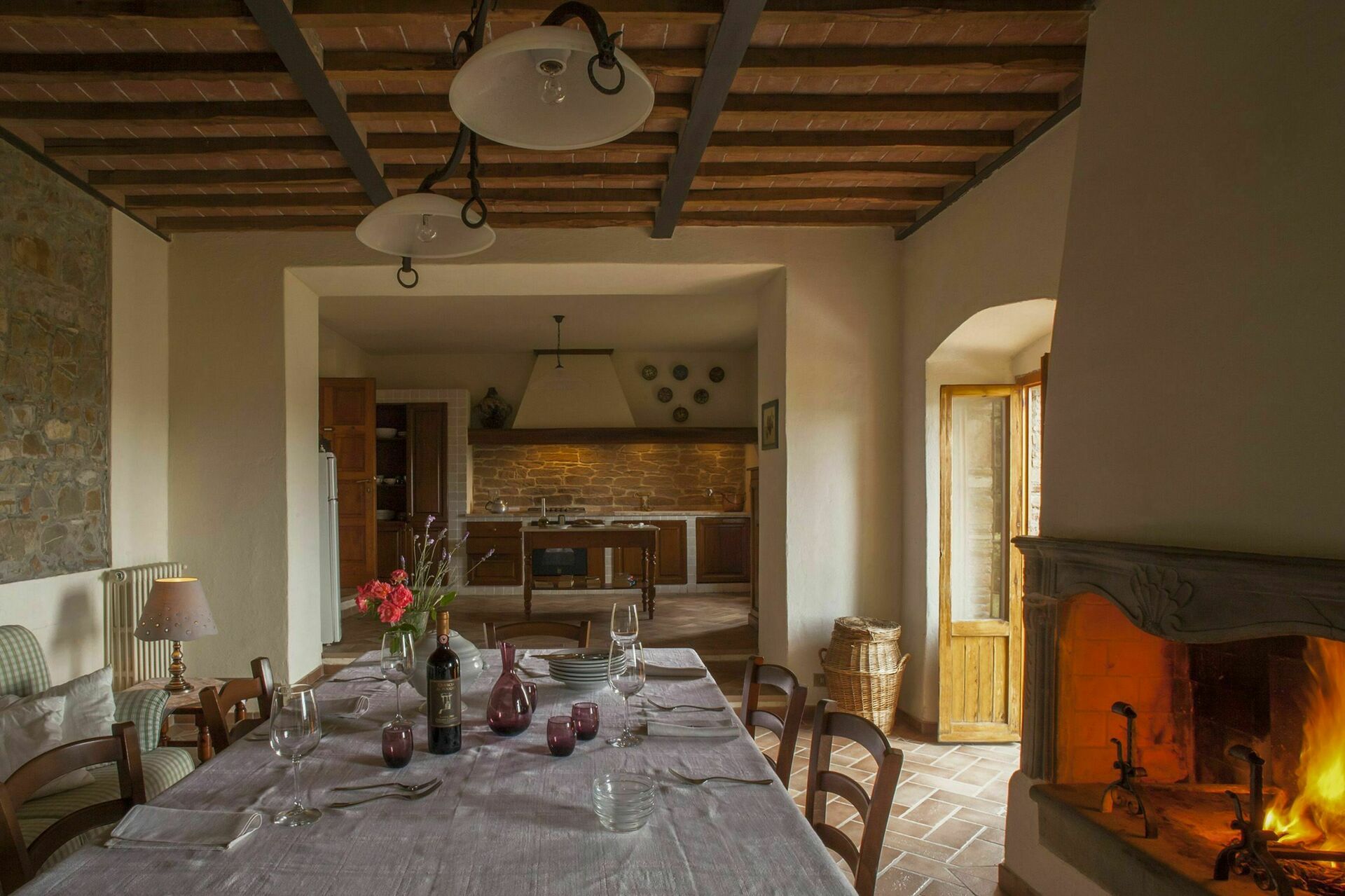 Kitchen + living room: dining table (people: 4), dishwasher, stove top, oven, italian coffee machine, sofa, armchair, fireplace.