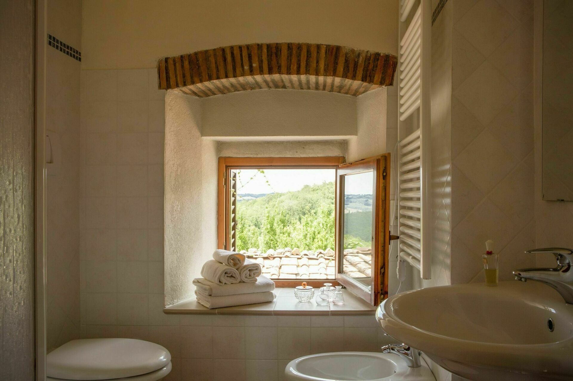 Bathroom: basin, toilet, bidet, shower.