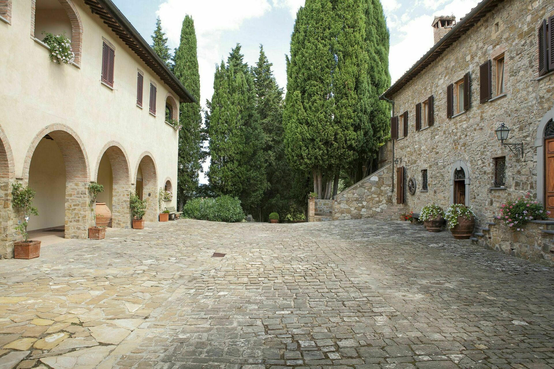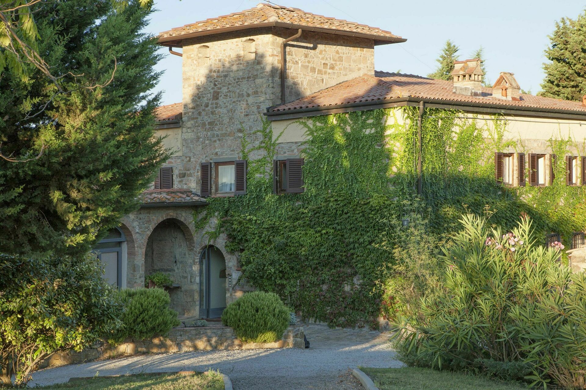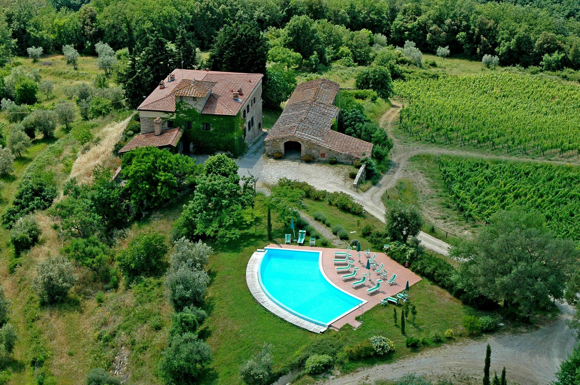 Chic and elegant, in the most picturesque surroundings, the incredible charming stone Tuscan villa and buildings of Fattoria di Quercia al Poggio make for the perfect place to have a dreamy destination wedding in Tuscany. Comprised of ten different apartments that can accommodate up to 42 people with 22 bedrooms and 17 bathrooms the property boasts two private swimming pools, stylish and cosy interiors, and extensive grounds with lots of amenities. Tucked away, far from the main road, this little slice of paradise is nestled in an elevated position overlooking the rolling hills and pastoral Tuscan landscape that surrounds. Located 15 km (9 mi) from Barberino Val D'elsa and only 24 km (15 mi) from the famously pretty medieval town of San Gimignano and both near Siena and near Florence too, this is an utterly idyllic spot in the Tuscan countryside made even more lovely by the fact that the property is on a working farm producing delicious olive oil and wines and that the vineyard, forest, olive grove, and considerable grounds can all be freely explored and enjoyed by guests.