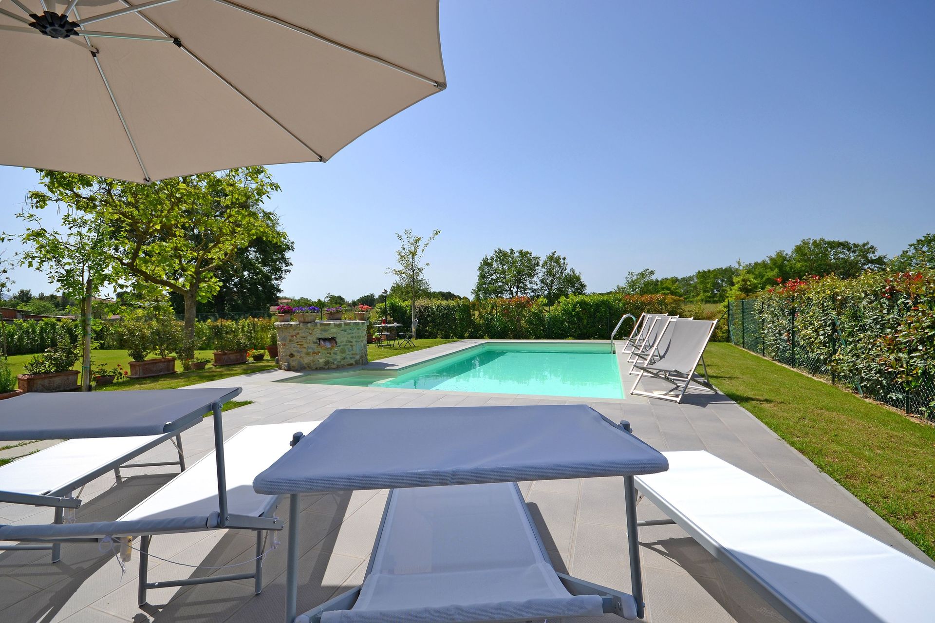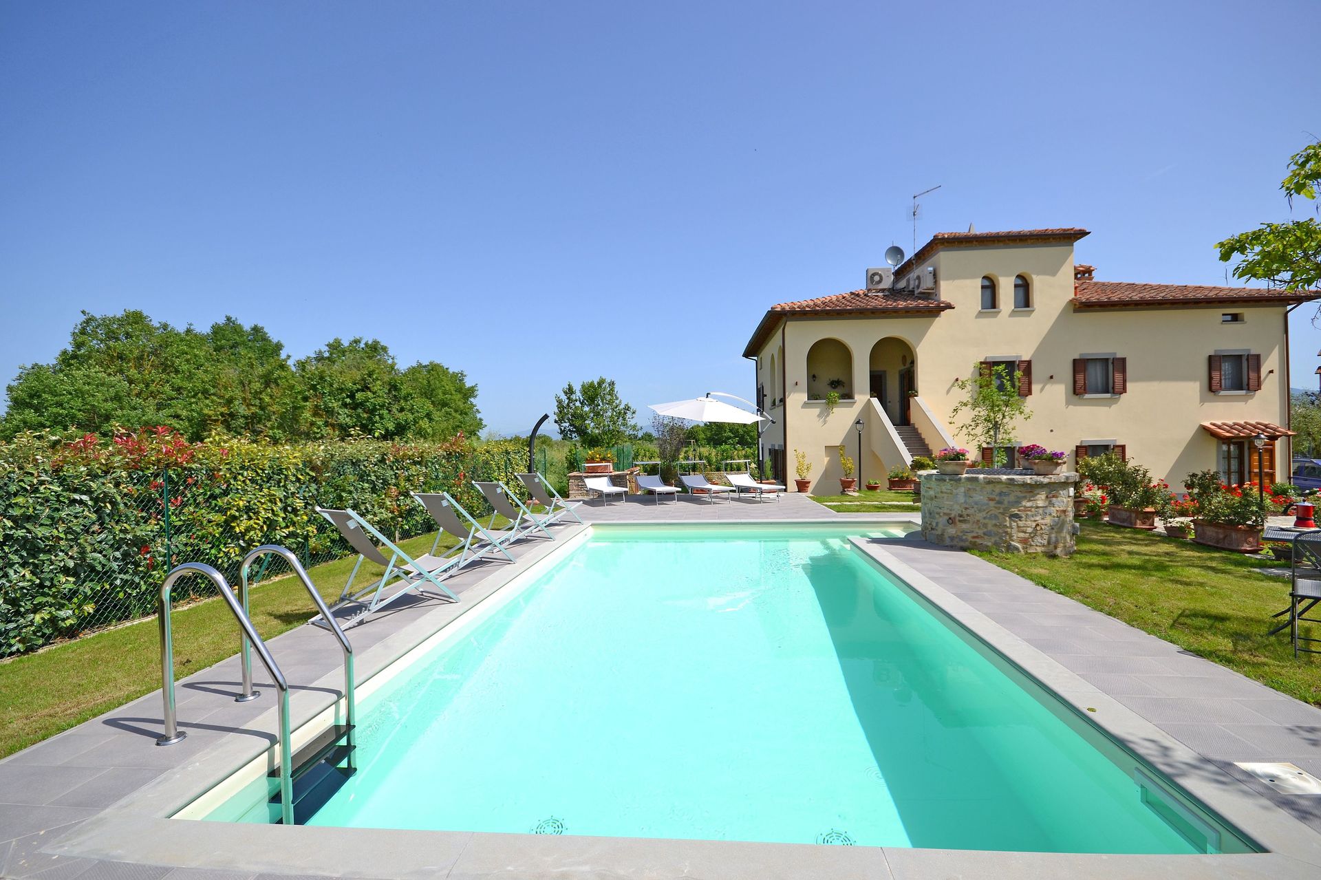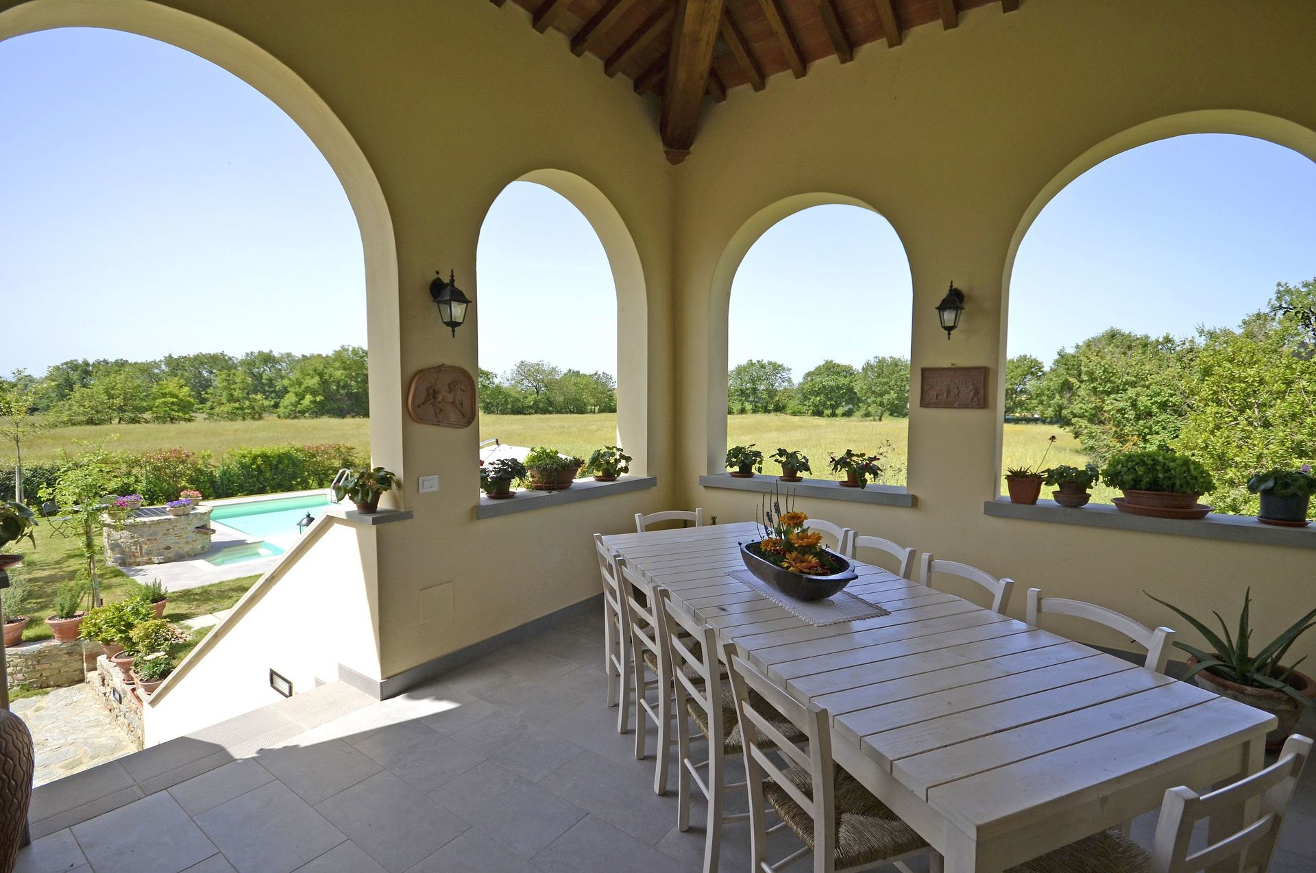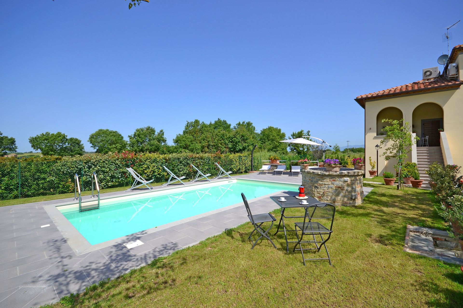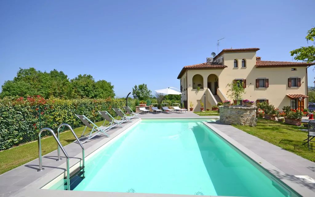 After arriving you’ll find a lovely clean well-maintained property with views of the hills perfect for a splendid vacation in Tuscany. After a busy day of shopping, spend some time with friends and family poolside enjoying a glass of wine - a perfect way to unwind at the end the day. Dining with friends and family is a big part of the Tuscan culture. Take advantage of the well-equipped kitchen to prepare meals using local produce while on your vacation. The kitchen includes coffee machine, microwave, toaster, stove and refrigerator, as well as, plenty of tableware and cutlery for up to ten people. Dine 'al fresco' like a real Tuscan, the fully furnished veranda is the ideal setting to enjoy food, family and the beautiful Tuscan weather.