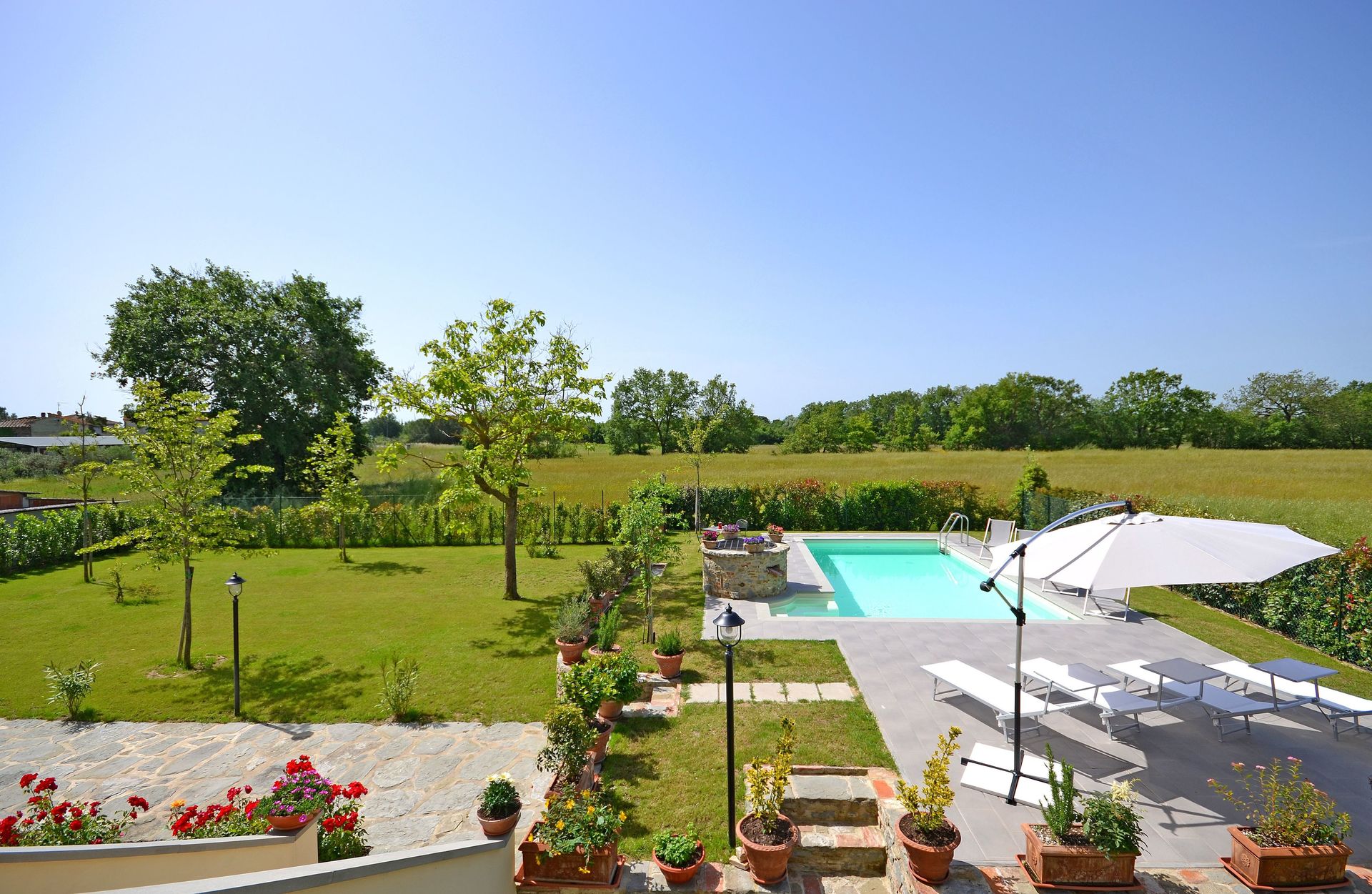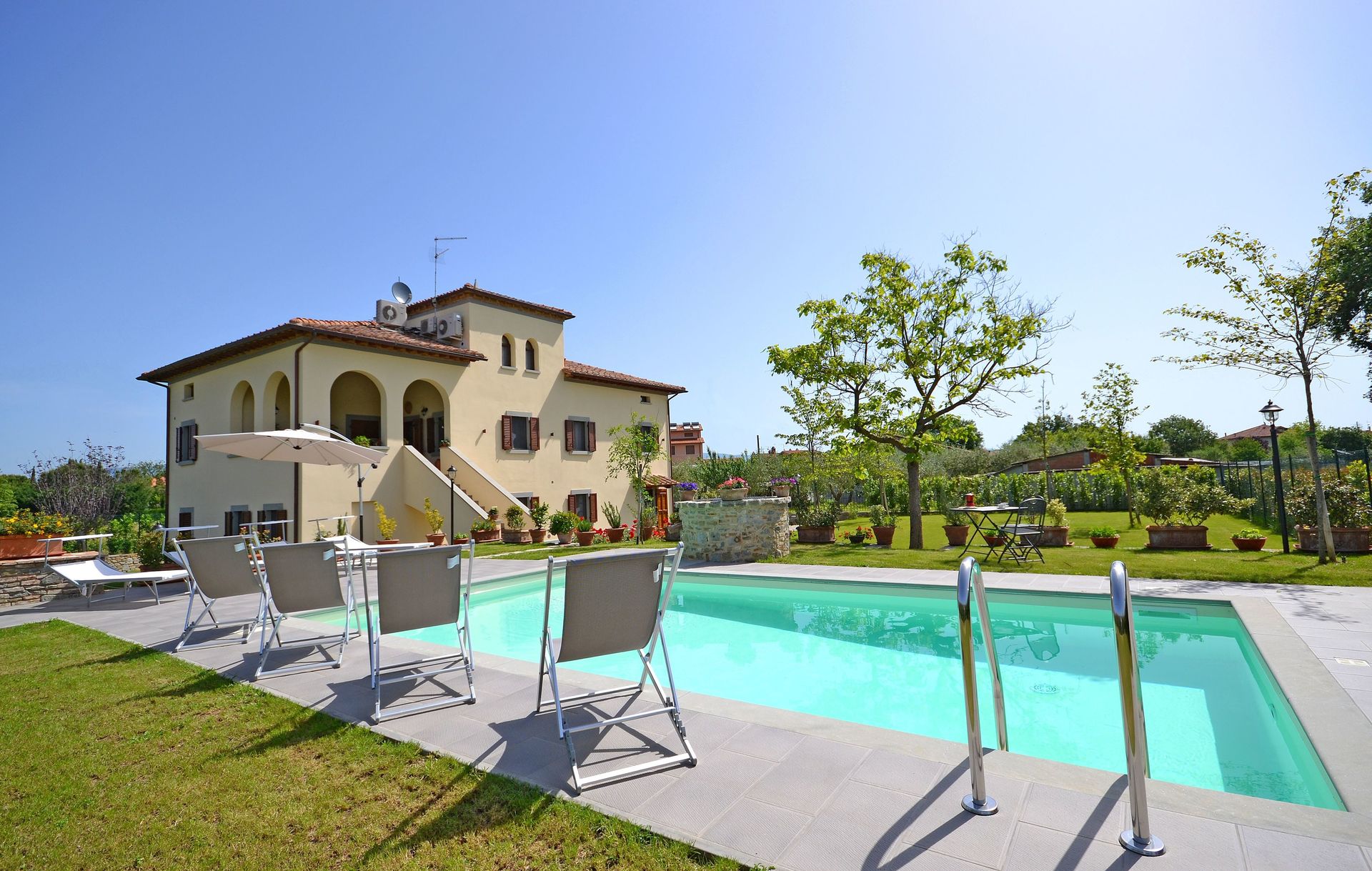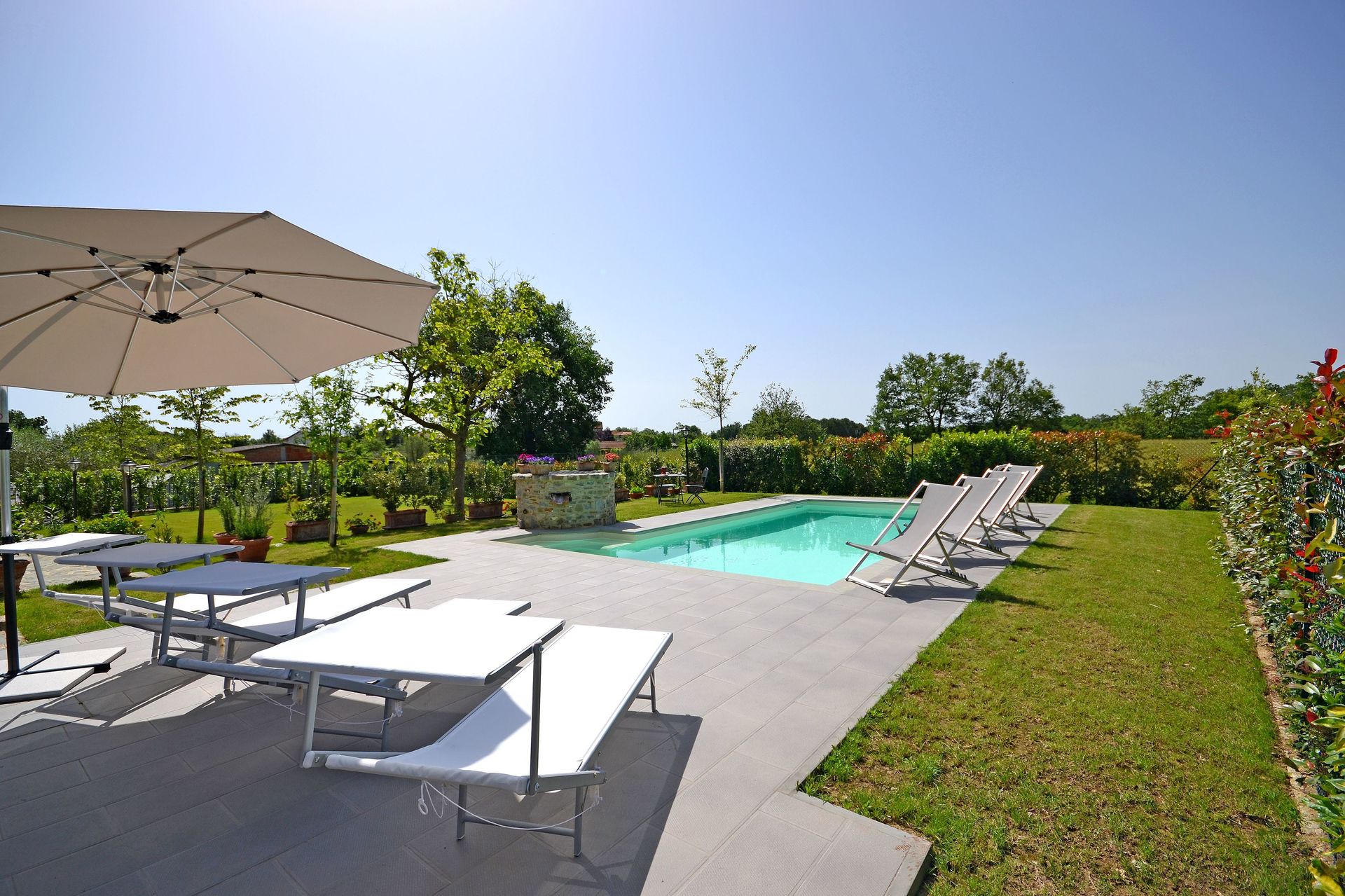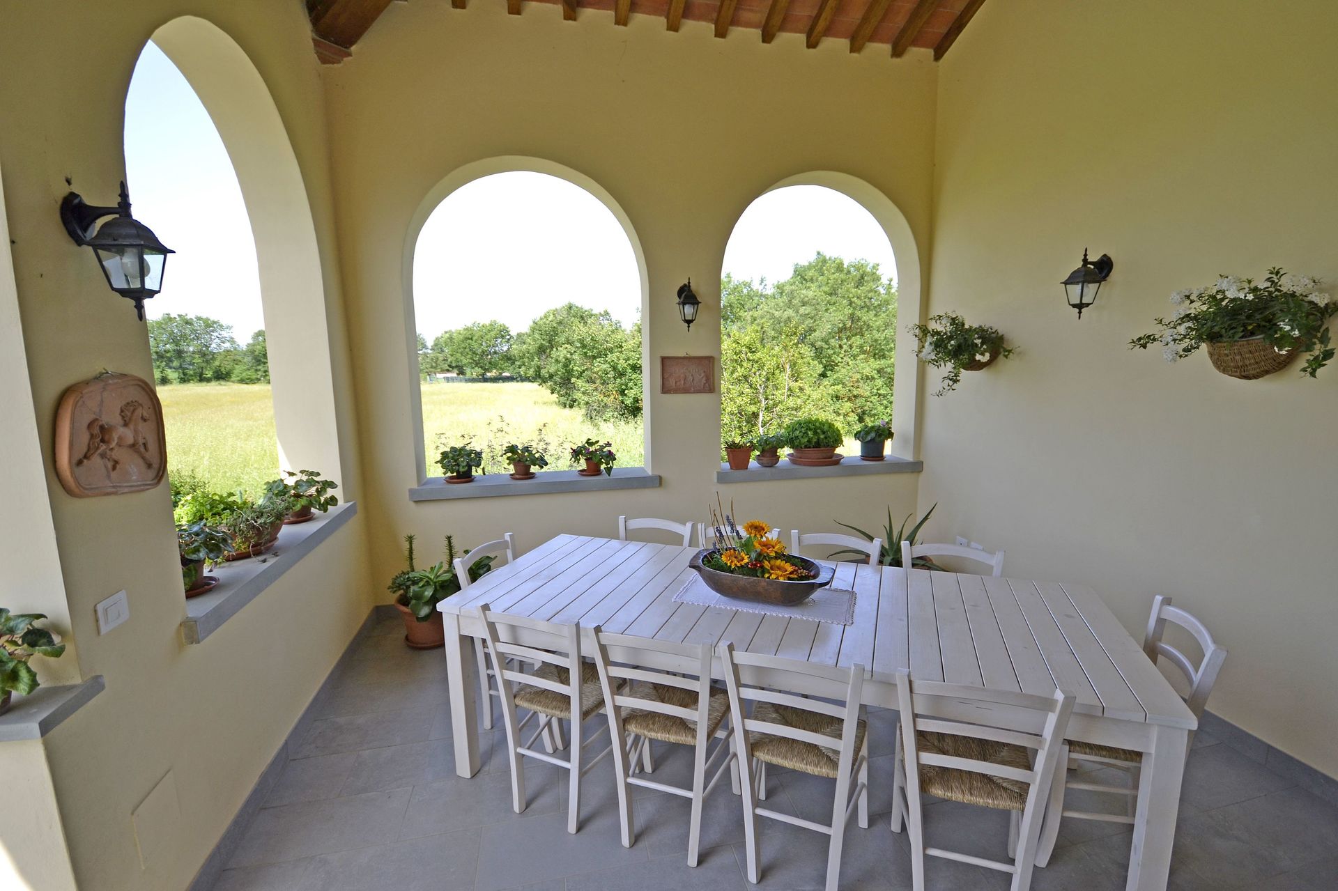 After arriving you’ll find a lovely clean well-maintained property with views of the hills perfect for a splendid vacation in Tuscany. After a busy day of shopping, spend some time with friends and family poolside enjoying a glass of wine - a perfect way to unwind at the end the day. Dining with friends and family is a big part of the Tuscan culture. Take advantage of the well-equipped kitchen to prepare meals using local produce while on your vacation. The kitchen includes coffee machine, microwave, toaster, stove and refrigerator, as well as, plenty of tableware and cutlery for up to ten people. Dine 'al fresco' like a real Tuscan, the fully furnished veranda is the ideal setting to enjoy food, family and the beautiful Tuscan weather.