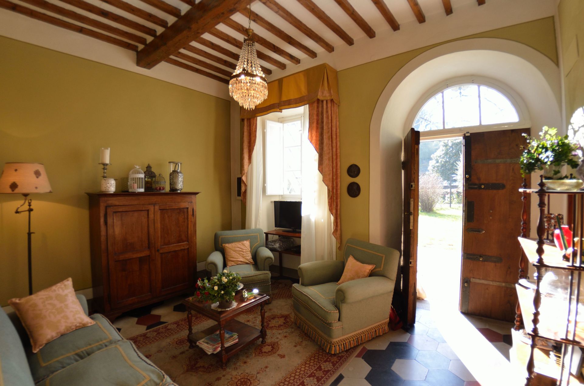 The house is tastefully furnished, in Tuscan style with antique furnishings as for example the beds and cupboards, antique pieces as for the toilette table made of ceramic and iron, beamed ceilings, some of the rooms have ceilings with frescos, terracotta tiled floors and the walls are painted in delicate pastel colours. External utility room with washing machine, boiler, wc, sink and shower.