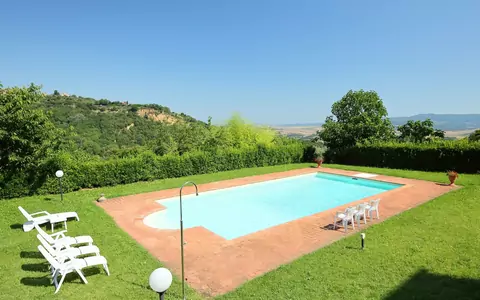Nestled on top of a hill just 2 km from the historic center of Volterra, Italy, this beautifully renovated farmhouse villa dates back to 1850 and offers a truly authentic Tuscan experience. Originally built as a hunting hut, the oldest part of the estate still bears witness to its fascinating past through a series of hunting frescos adorning the dining and living room. Over the centuries, the property has served various purposes, including as a farmer's house and a stable, before being thoughtfully restored into the welcoming retreat it is today. The estate, known as "Podere Valle di Sotto," is a large working farm that immerses you in the serene beauty of the surrounding Tuscan countryside. The property includes 2 separate apartments, one traditionally reserved for the caretaker and one for the owners, offering a sense of privacy and authenticity rarely found elsewhere. Guests benefit from a private garden, ample parking directly at the property, and reliable internet Wi-Fi connectivity, ensuring both comfort and convenience throughout their stay. The seasonal swimming pool, available from May 16th to October 15th, adds a refreshing dimension to this already exceptional rural escape.