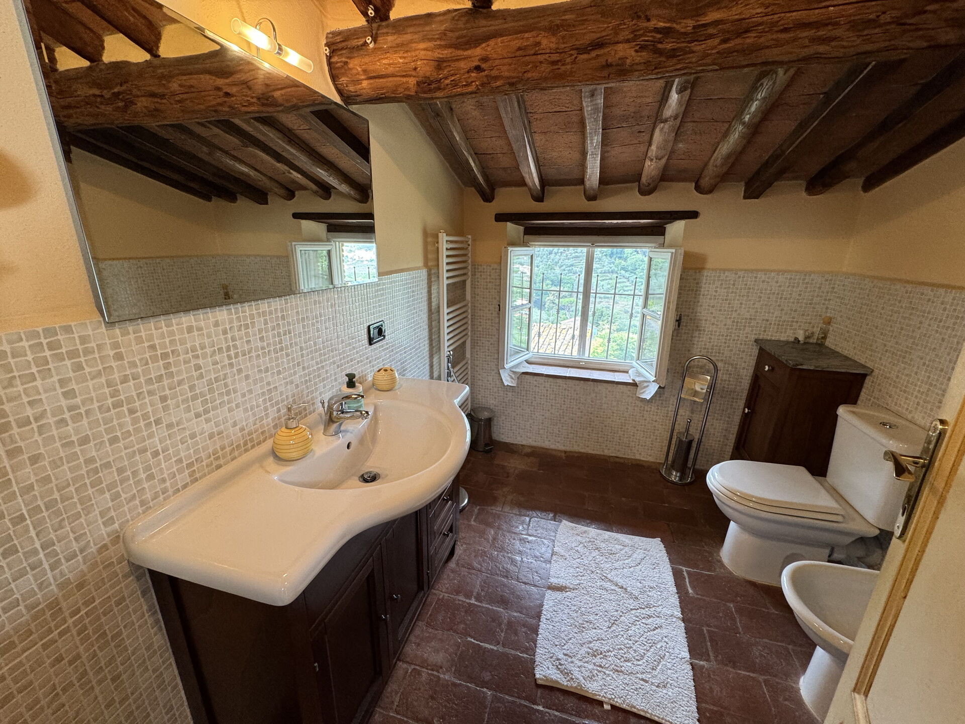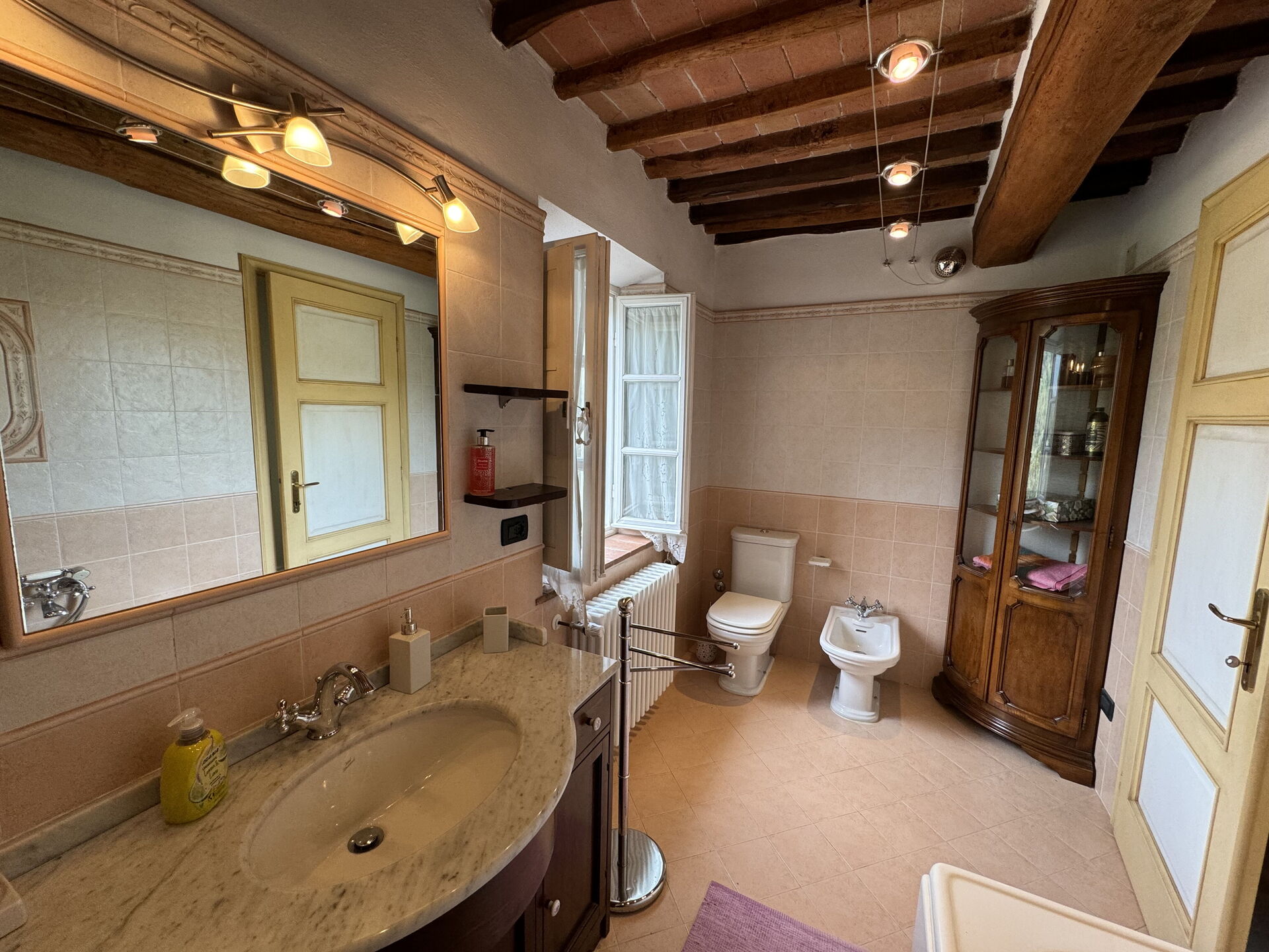 Bathroom: basin, toilet, bidet, shower.