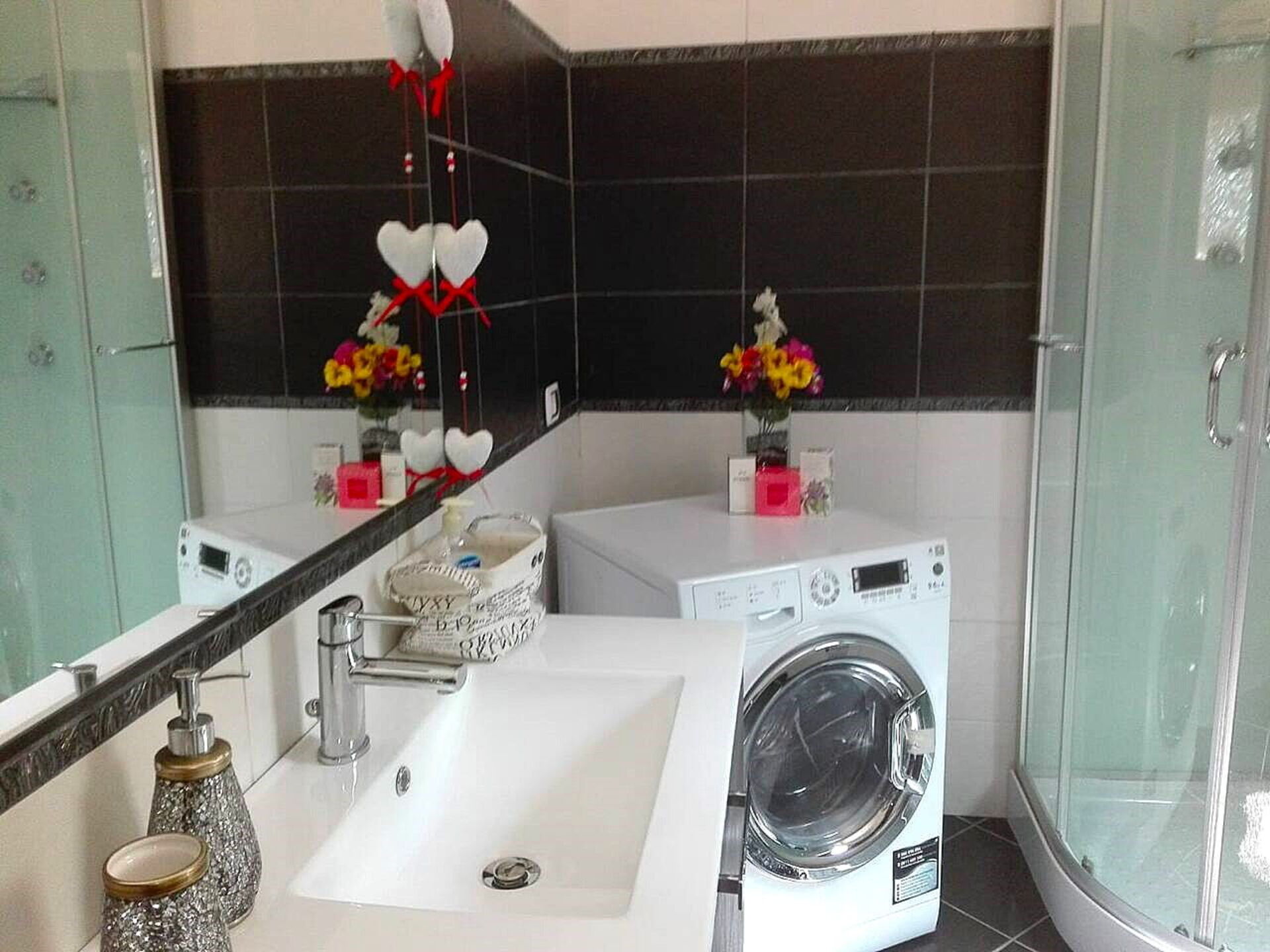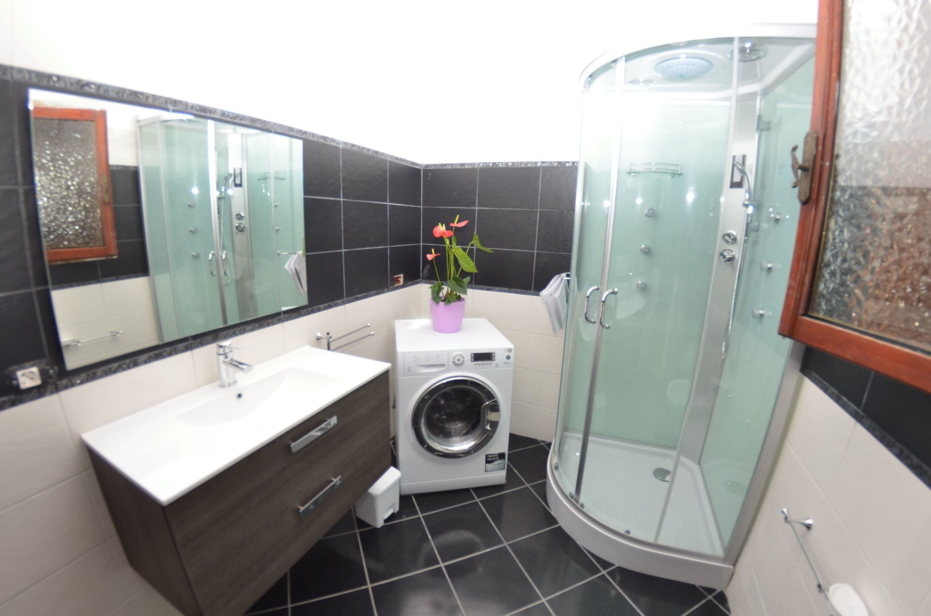 Bathroom: basin, toilet, bidet, shower, washing machine.