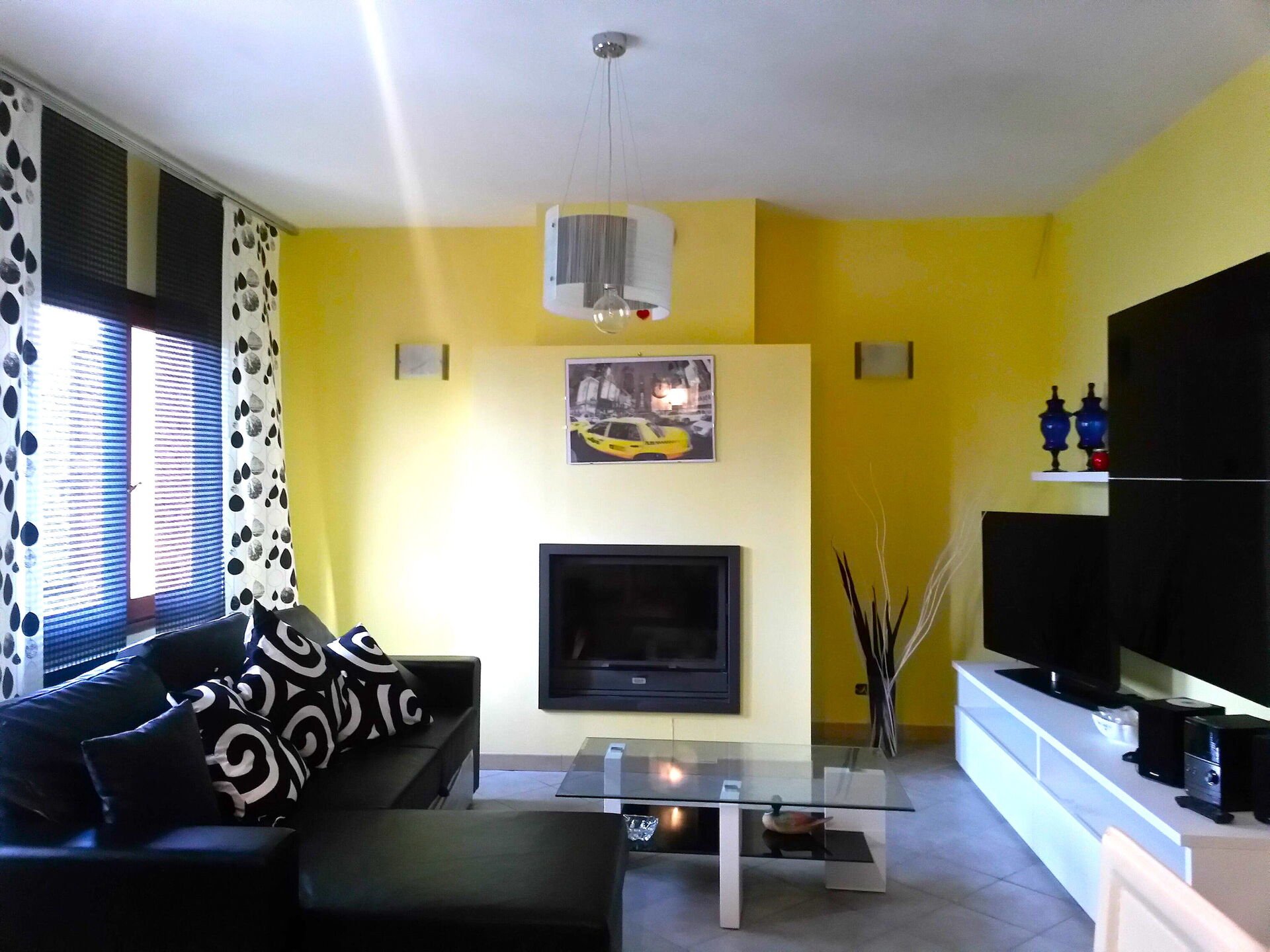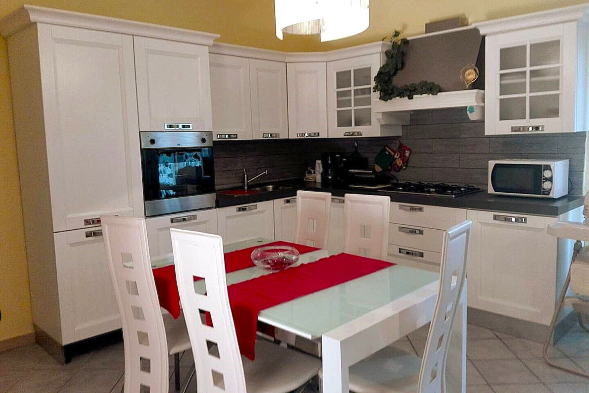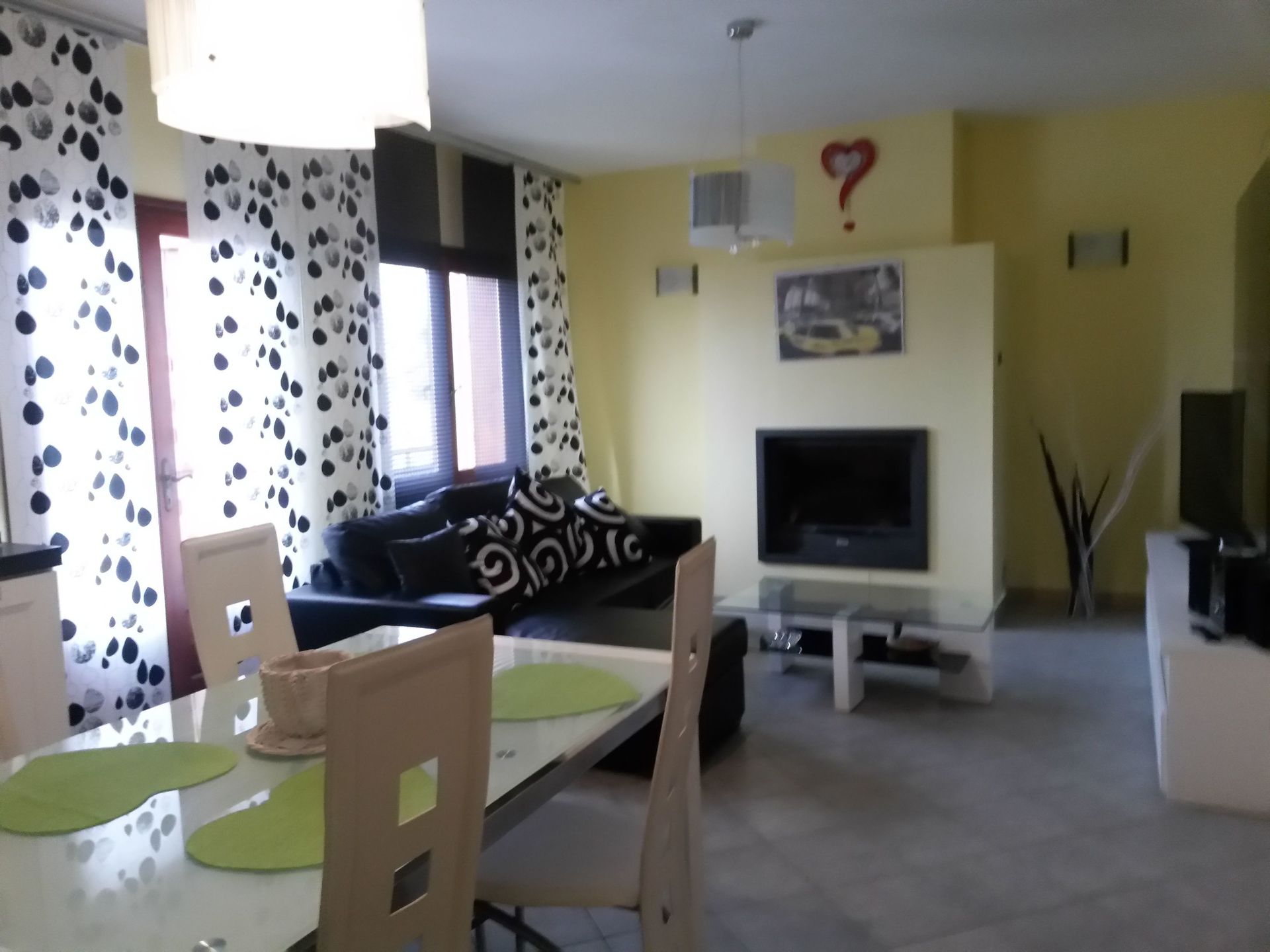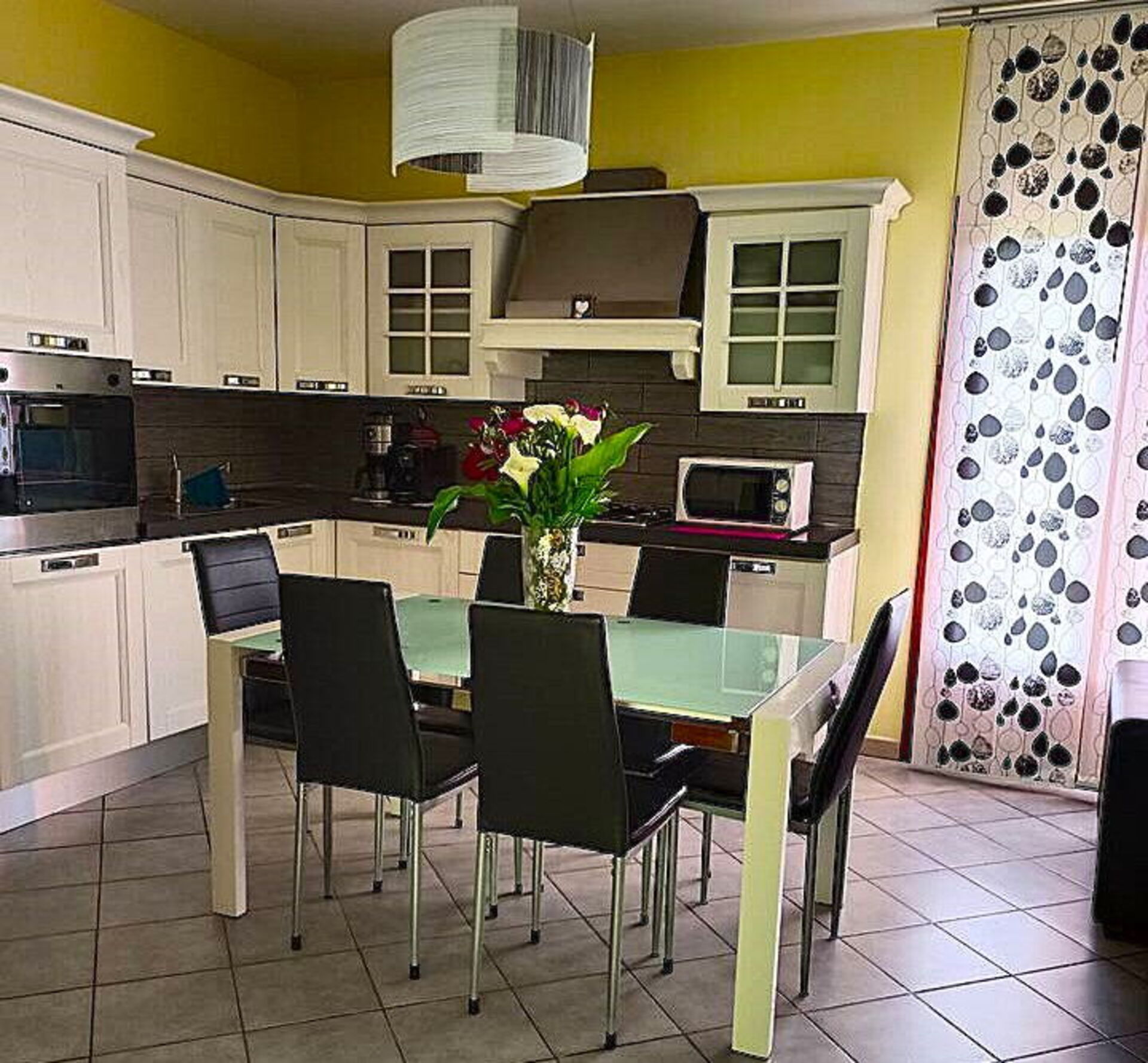 Open space: fireplace, dining table (people: 8), sofa bed, television, fridge, stove top, freezer, dishwasher, well equipped kitchen, microwave, oven, exit to the terrace.