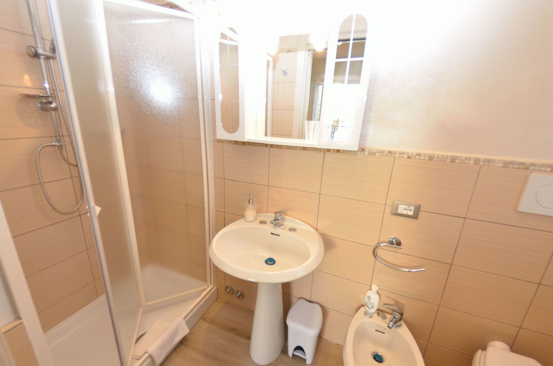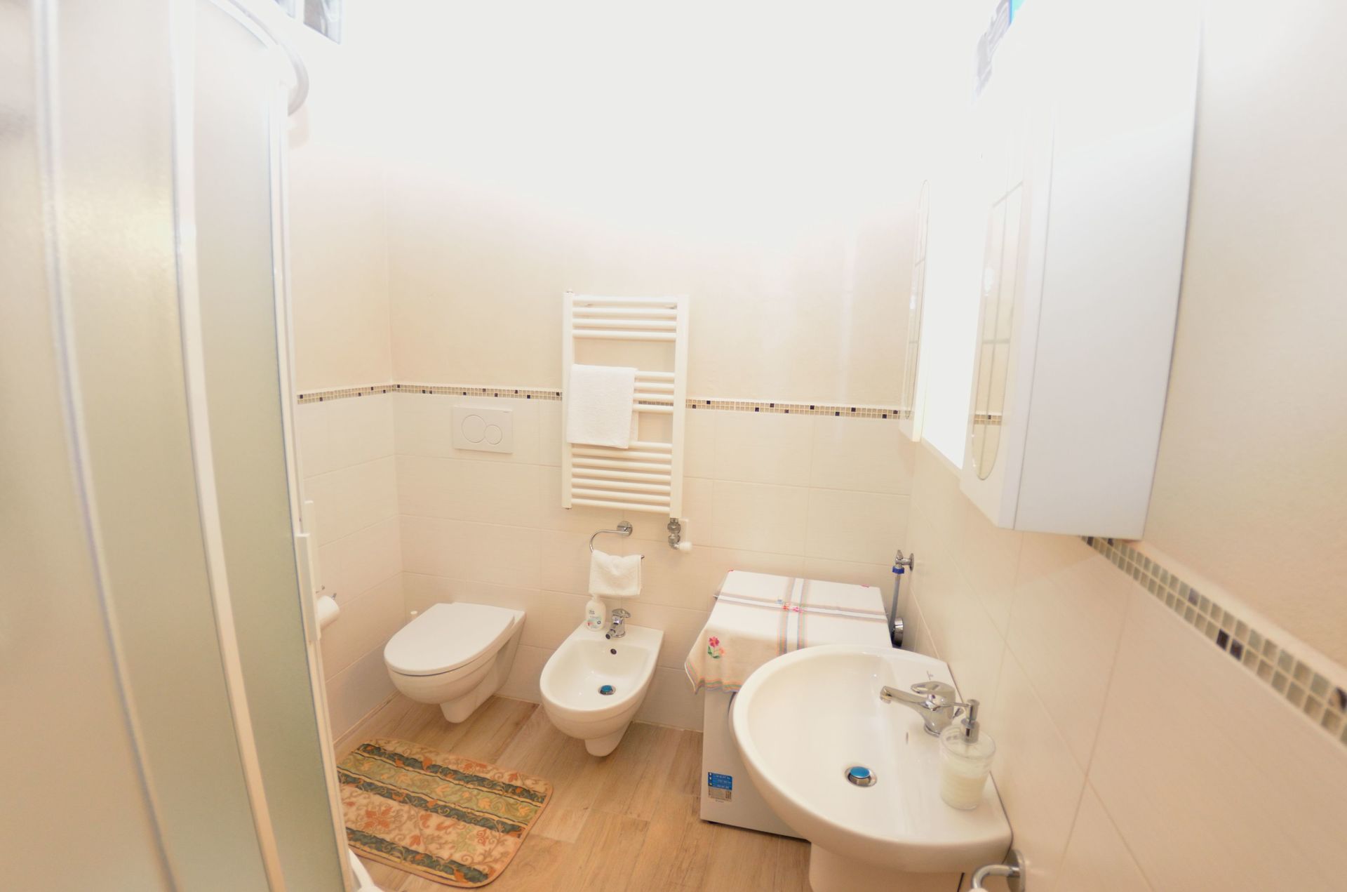 Bedroom + Ensuite Bathroom: double bed, bunk bed, basin, toilet, bidet, shower, washing machine.