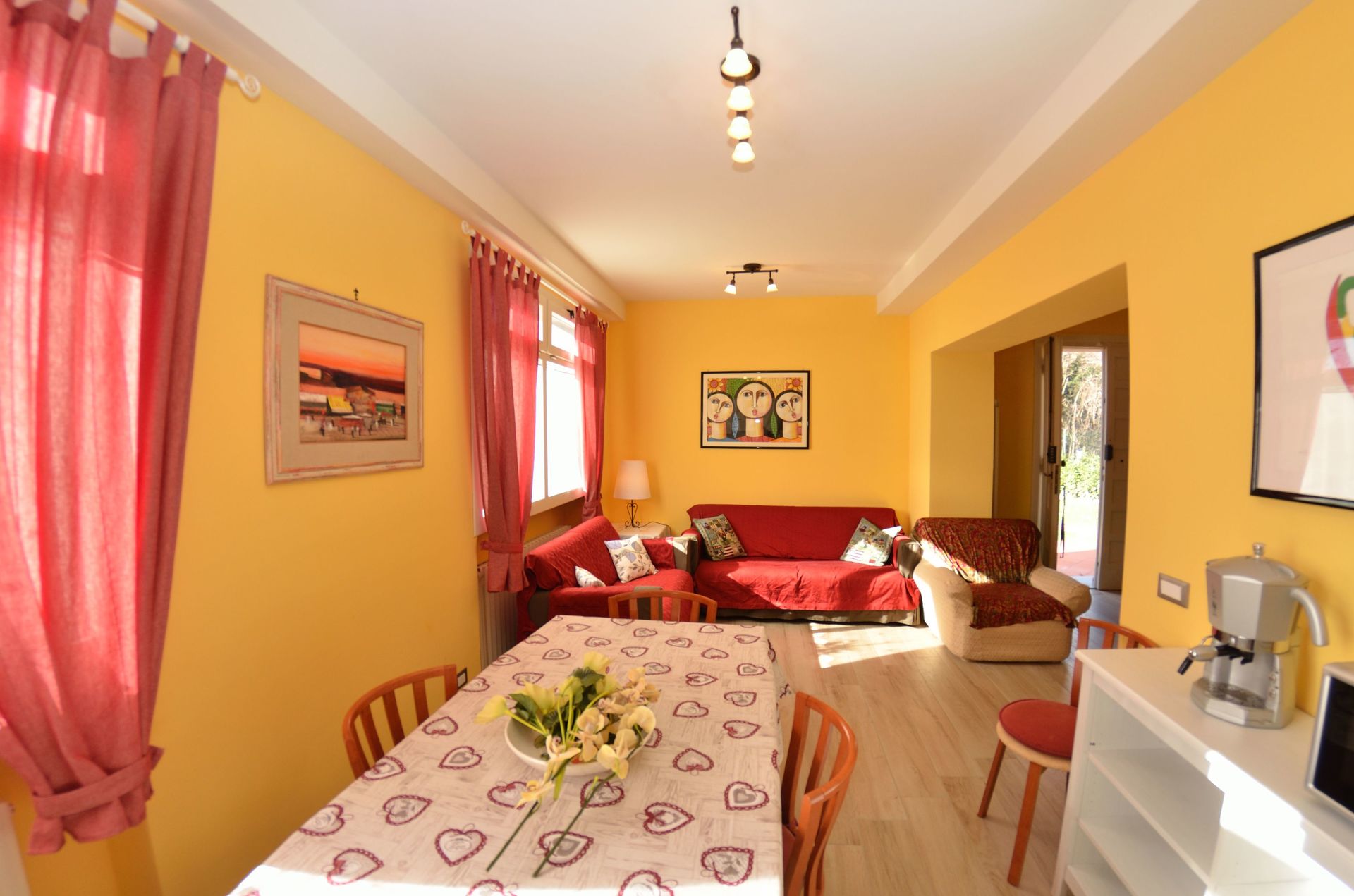 Kitchen: dining table (people: 3), fridge, freezer, microwave, stove top, oven, american coffee machine, satellite tv, exit to the garden, two sofas.