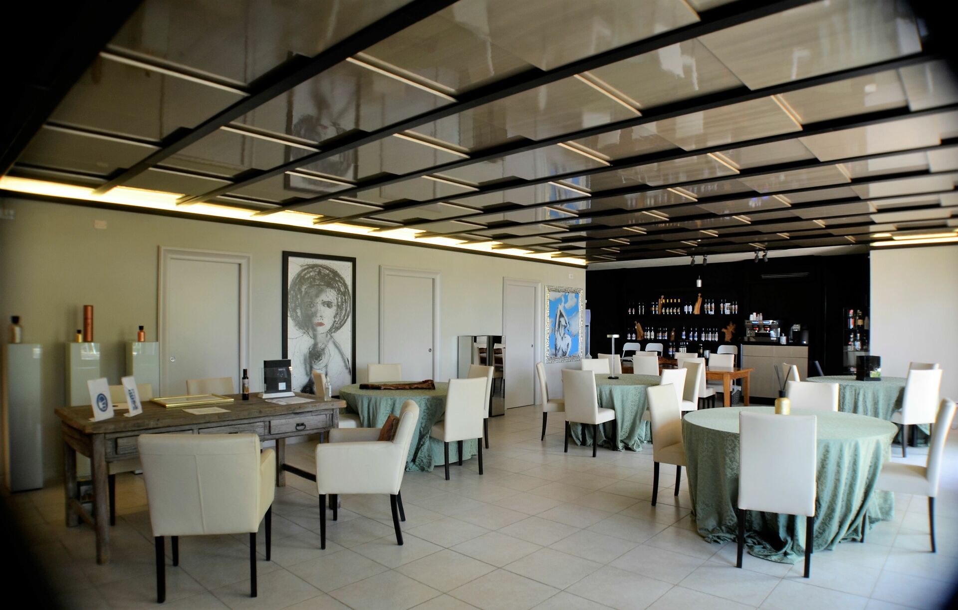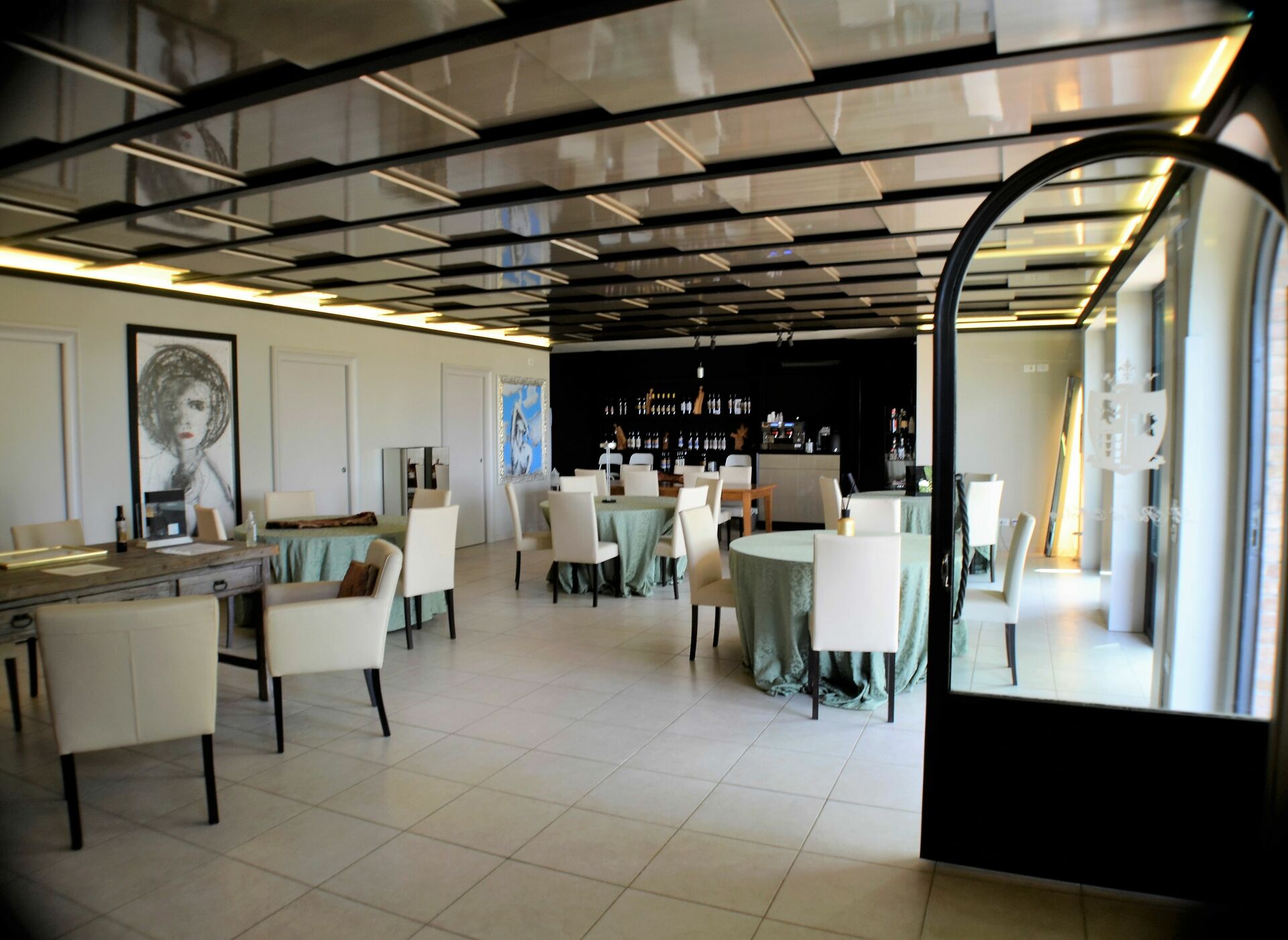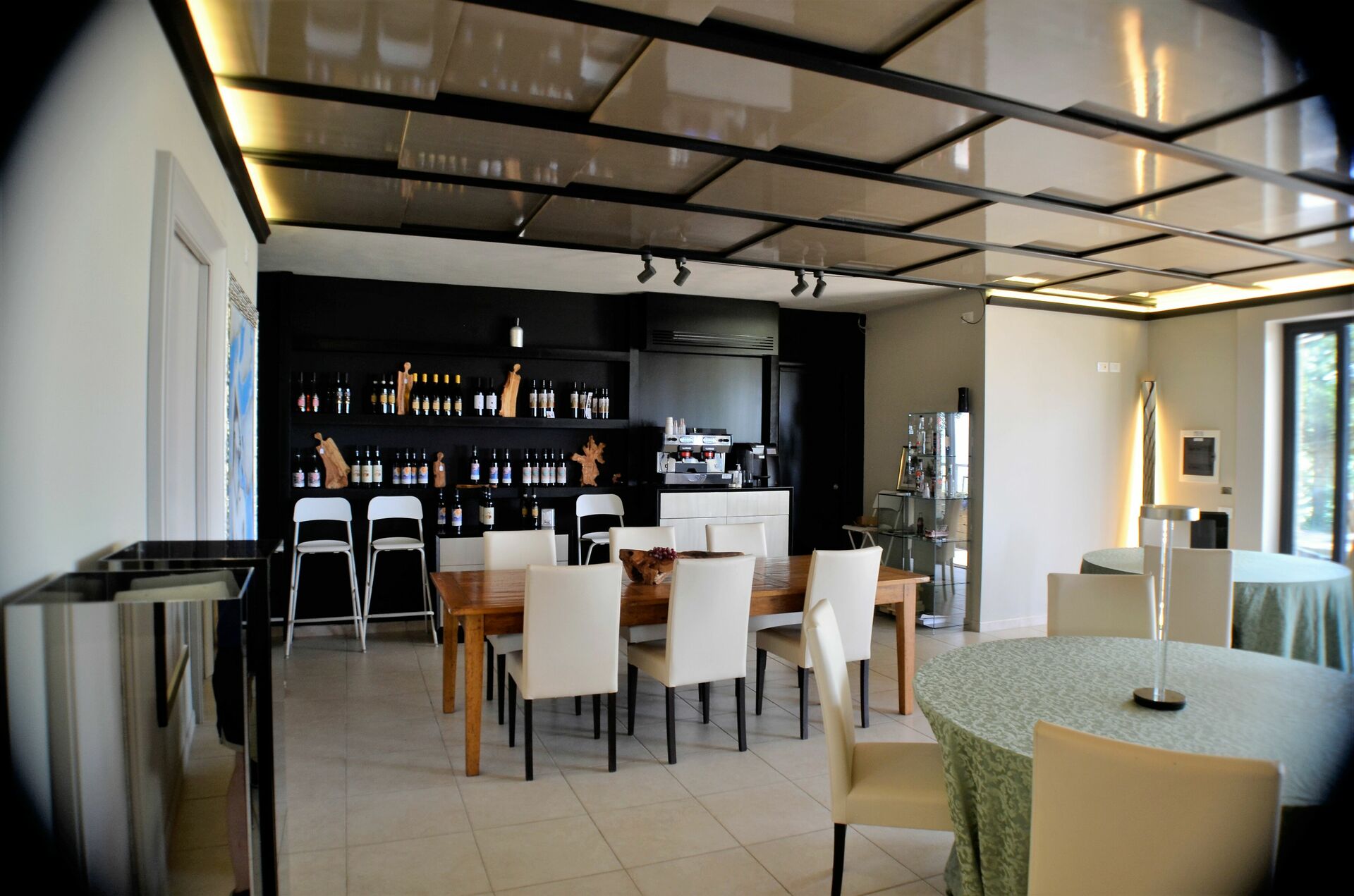 Dining room (25 m2): six dining tables (people: 30), four armchairs, WIFI internet, internet, highchair, smoke detector, co2 detector, exit to the garden, exit to the patio, exit to the terrace.