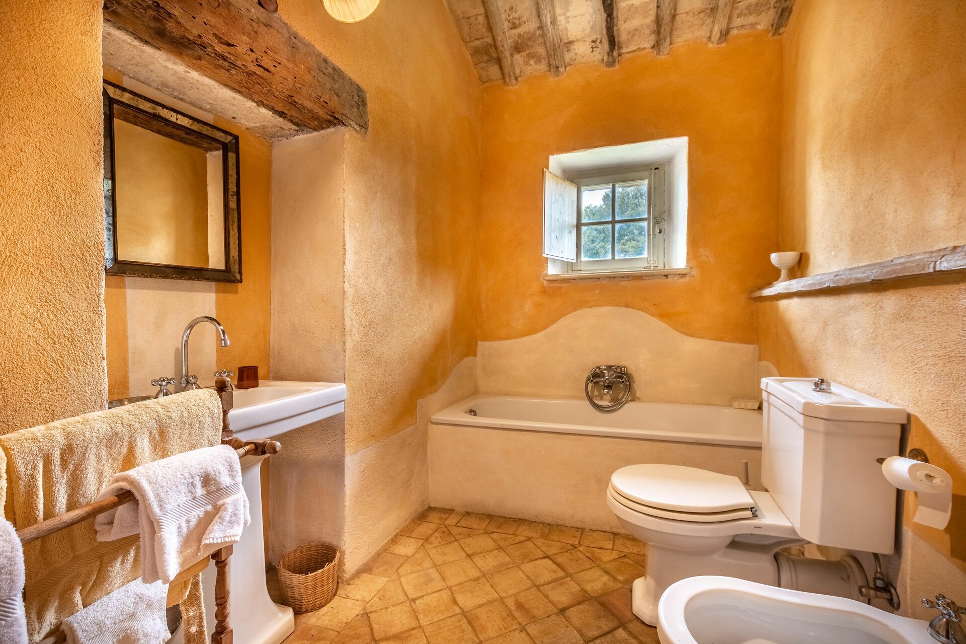 Bedroom + Ensuite Bathroom: double bed, WIFI internet, basin, toilet, bidet, bathtub.