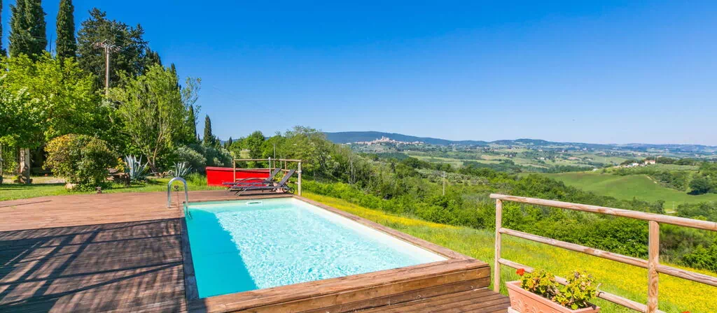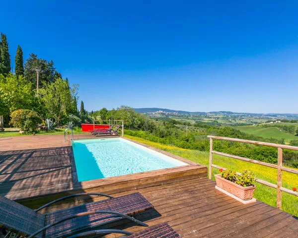 Nestled in the picturesque hamlet of Casaglia in the heart of Tuscany, Italy, "Podere San Lorenzo" is a beautifully restored semi-detached country house that offers an exceptional vacation rental experience for those seeking tranquility and authentic rural charm. Fully renovated in 2005, this property enjoys a serene, sunny, and elevated position on a gentle slope, surrounded by fields, meadows, and vineyards that paint a quintessentially Tuscan landscape. Situated just 8 kilometers from Poggibonsi and equally close to San Gimignano, the property strikes an ideal balance between peaceful seclusion and convenient access to the region's most celebrated destinations. Guests benefit from a generously sized yard spanning 2,000 square meters of beautifully landscaped terraced garden, enclosed by a fence, natural garden, and orchard, offering ample space to unwind and connect with nature. A refreshing above-ground swimming pool measuring 6 x 3 meters with a depth of 140 centimeters is available seasonally from May 1st to October 10th, providing the perfect setting for leisurely summer days under the Tuscan sun. Reliable internet and Wi-Fi connectivity ensure that guests remain effortlessly connected throughout their stay, while on-site parking accommodates up to 3 cars, making arrival and departure entirely stress-free.