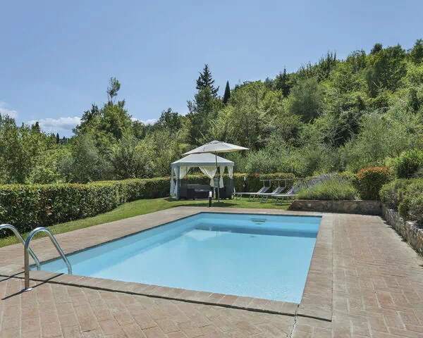 The outdoor spaces at "Amos" are thoughtfully designed to encourage relaxation and a deep connection with the surrounding natural landscape. The 2,000 square meter private lot hosts a terraced garden that, while unfenced, embraces the beauty of the Tuscan countryside with a wildlife garden and an open meadow. The swimming pool, measuring 8 by 4 meters with a depth ranging from 100 to 160 centimeters, is available seasonally from May 1st to October 30th, offering a refreshing retreat during the warmer months. Complementing the pool area, you will find an outdoor shower, a charming arbor, and garden furniture, creating an inviting environment for outdoor dining, leisure, and unwinding beneath the open sky.