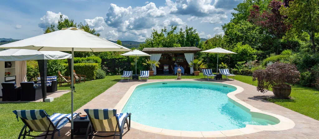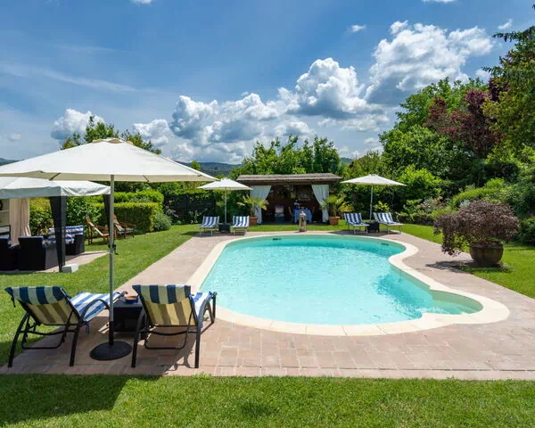 Nestled in the tranquil Santa Firmina district, just 4 km from the heart of Arezzo, Italy, the single-family house "Cadellura" offers an exceptional holiday rental experience that seamlessly blends privacy with convenience. This beautiful home provides a quiet and peaceful retreat from the energy of the city, while keeping you close enough to enjoy everything that Arezzo and its surroundings have to offer. The property sits within a generous 10,000 m2 fenced estate, where a terraced garden of lawn, trees, and an orchard creates a lush and serene setting. A kidney-shaped swimming pool measuring 10 x 5 m invites you to relax and enjoy the warmth of the Italian sun during the seasonal period from May 1st to September 30th. Wireless internet connection is available throughout the property, ensuring you remain connected throughout your stay. Parking is conveniently provided on the premises, and the expansive yard surrounding the house adds an extra layer of seclusion and natural beauty to your experience.