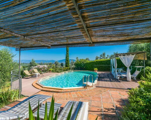 Nestled among trees, rolling fields, and sun-drenched vineyards in the heart of Impruneta, Italy, "Poggio de'Galli" is a charming country house holiday rental that promises an unforgettable retreat in the Tuscan countryside. Perched atop a hill, this sun-filled property commands breathtaking panoramic views of the surrounding landscape, offering guests a truly serene and picturesque setting. The estate benefits from a private swimming pool measuring 9 x 4 metres with a depth of 140 cm, available seasonally from 2 May to 26 September, perfect for relaxing afternoons under the Tuscan sun. The expansive yard, spanning 6 hectares of fenced grounds, encompasses lush trees, a natural garden, and open meadows, providing ample space for outdoor enjoyment and quiet contemplation. Guests also benefit from internet and Wi-Fi connectivity throughout their stay, ensuring comfort and convenience without compromising the peaceful rural atmosphere. Private parking is available on the property, making arrival and departure effortless for those travelling by car.