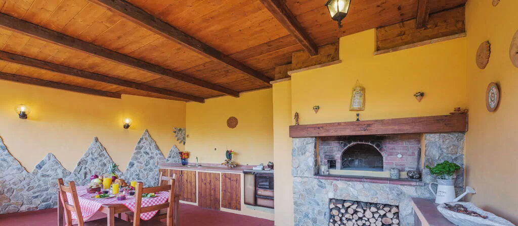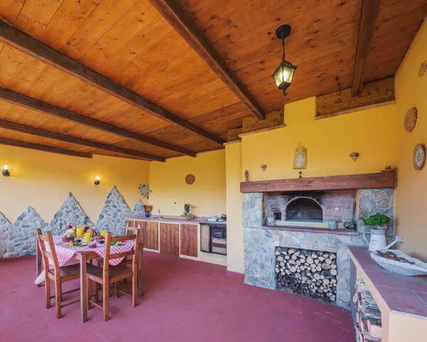 Immerse yourself in the natural beauty of the Italian countryside with the Mare e Monti chalet's private, terraced garden. Spanning an impressive 1,100 square meters and fenced with natural trees and plants, the garden offers a serene outdoor space to unwind and soak in the peaceful surroundings. A stepped path with 42 steps leads up to the house, nestled in the woods and providing breathtaking views of the encompassing landscape.