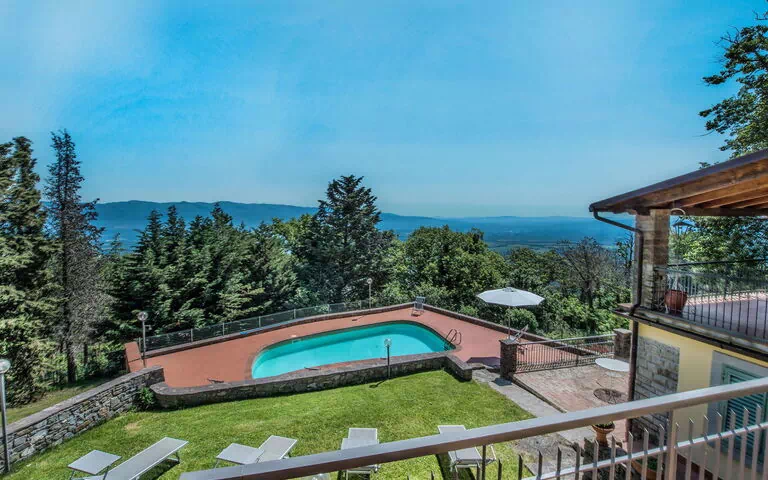 Caiano is a charming and rustic vacation rental located in the heart of Tuscany, 750 meters above sea level. Surrounded by nature, including trees, fields, and vineyards, it offers a peaceful escape from city life. The property boasts a private terraced garden spanning 1,000 square meters, complete with a wildlife garden, natural garden, meadow, and a seasonal swimming pool available from May 1st to September 30th. The pool's unconventional shape adds to the property's unique charm. Additionally, Caiano provides an outdoor shower, terrace, and parking for up to three cars.