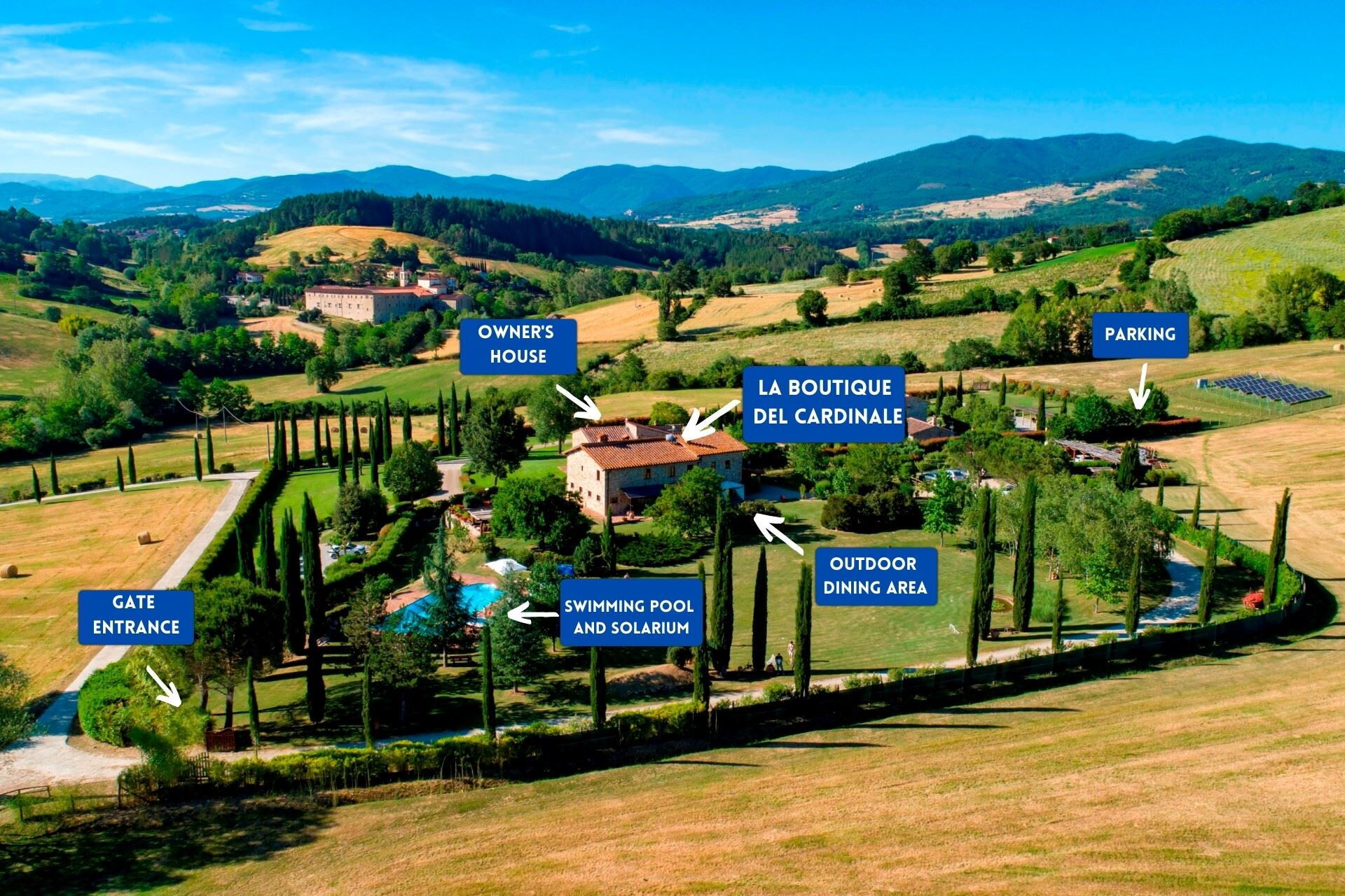 You will discover La Boutique del Cardinale in the green heart of Casentino, located less than a km from the village of Bibbiena. You can reach the village, for a dinner out or shopping, even on foot with a short walk through the countryside, among cultivated fields of a thousand colours. Close to the major attractions in the valley, such as the Sanctuary of the Madonna del Sasso, the Sanctuary of La Verna dear to Saint Francis of Assisi, the Castle of Poppi of the Conti Guidi and the beautiful Pieve of Romena, the villa is about 30 km from Arezzo and 60 km from Firenze and will be perfect, as a starting point, for your trips to discover Tuscany.