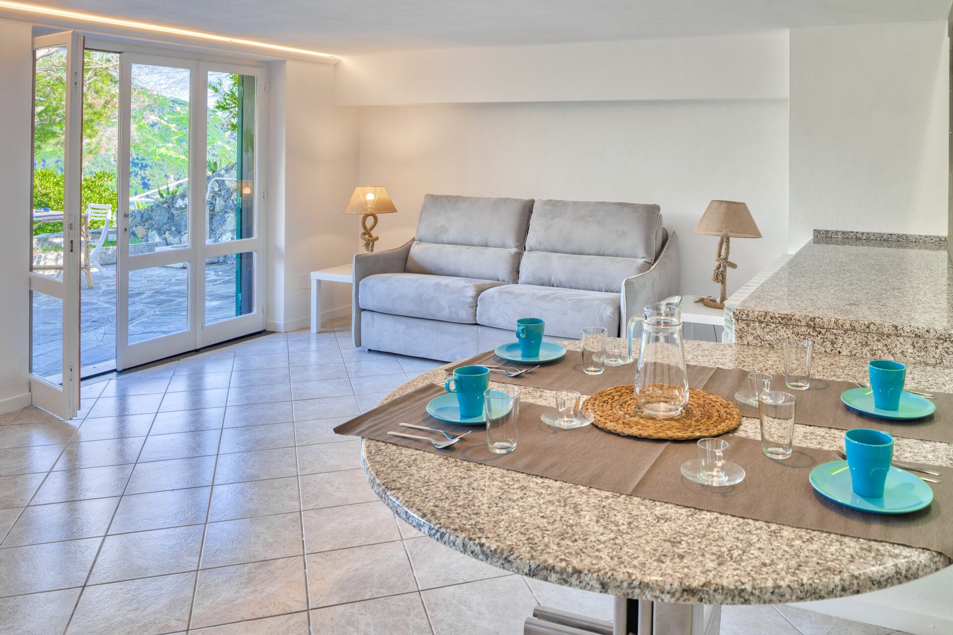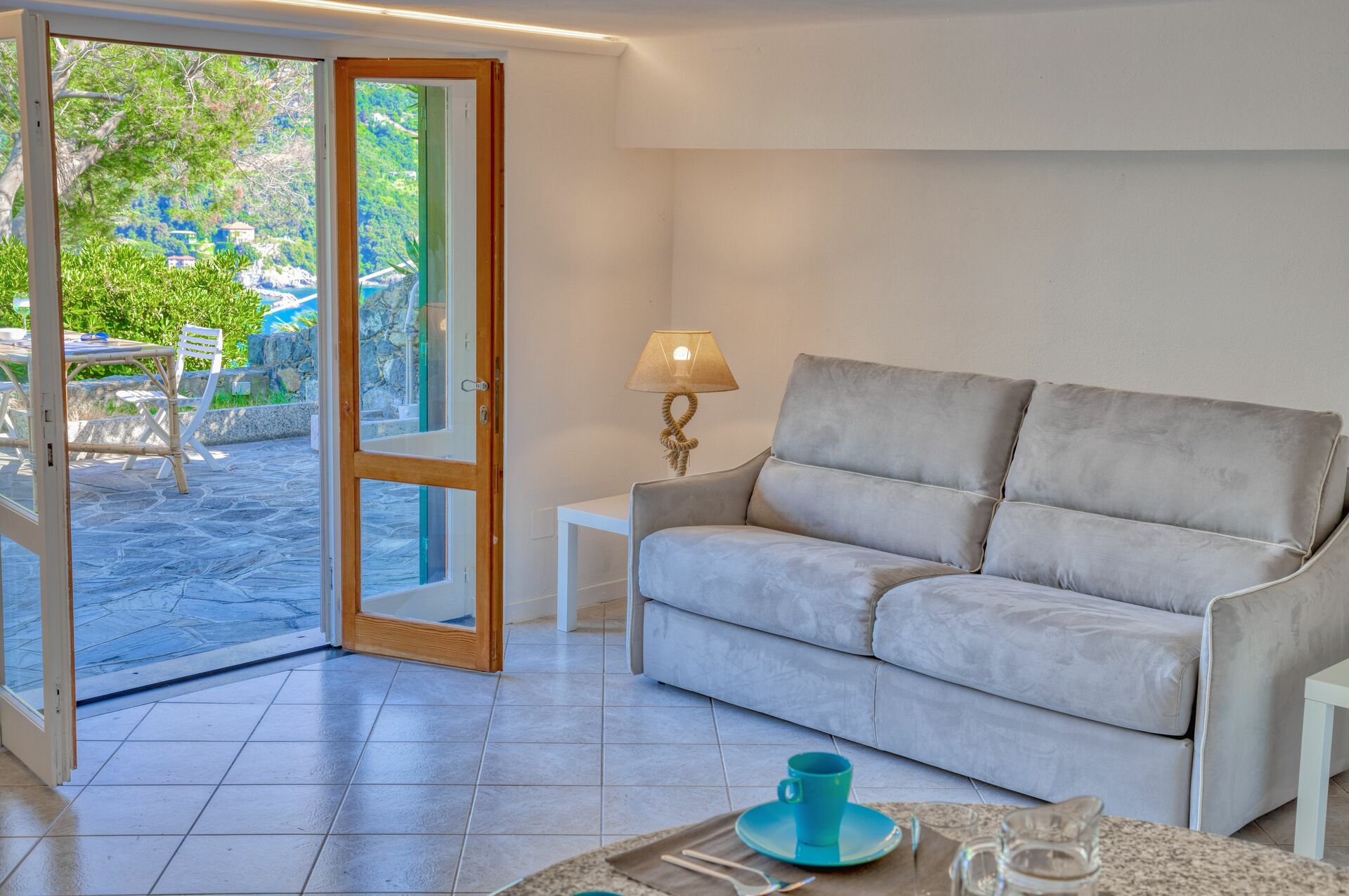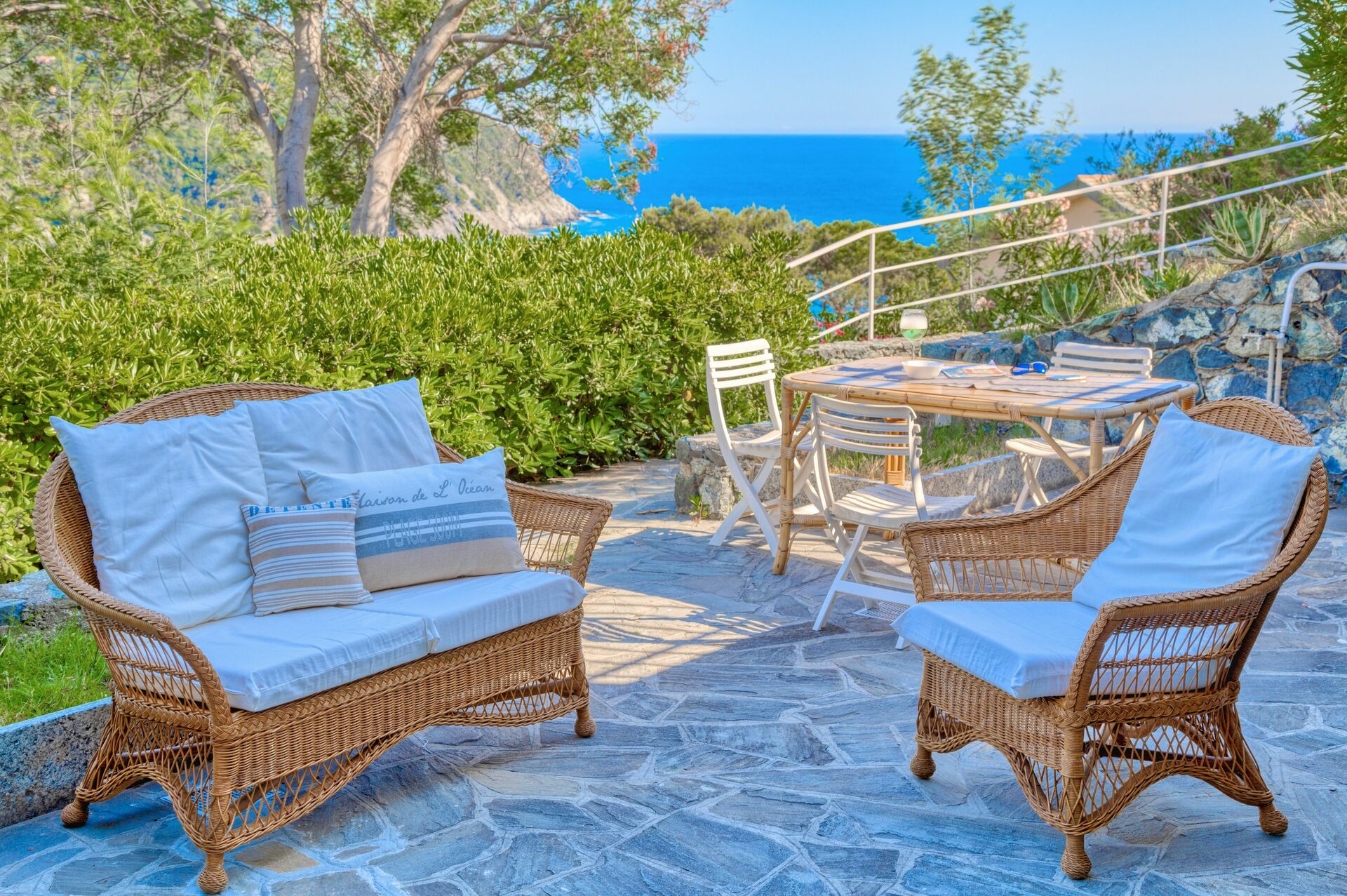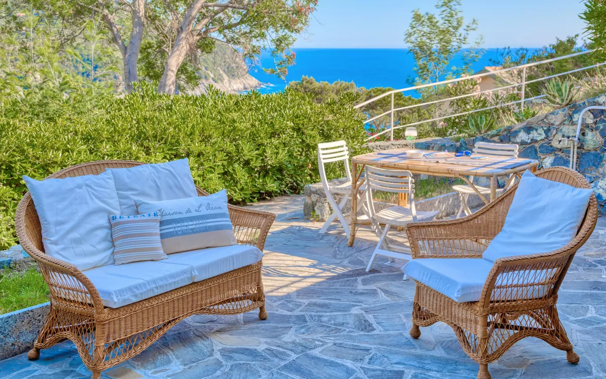 The external area has garden furniture, table with chairs and a little sofa, to enjoy breakfasts or dinners outdoors, with a breathtaking view of the sea.