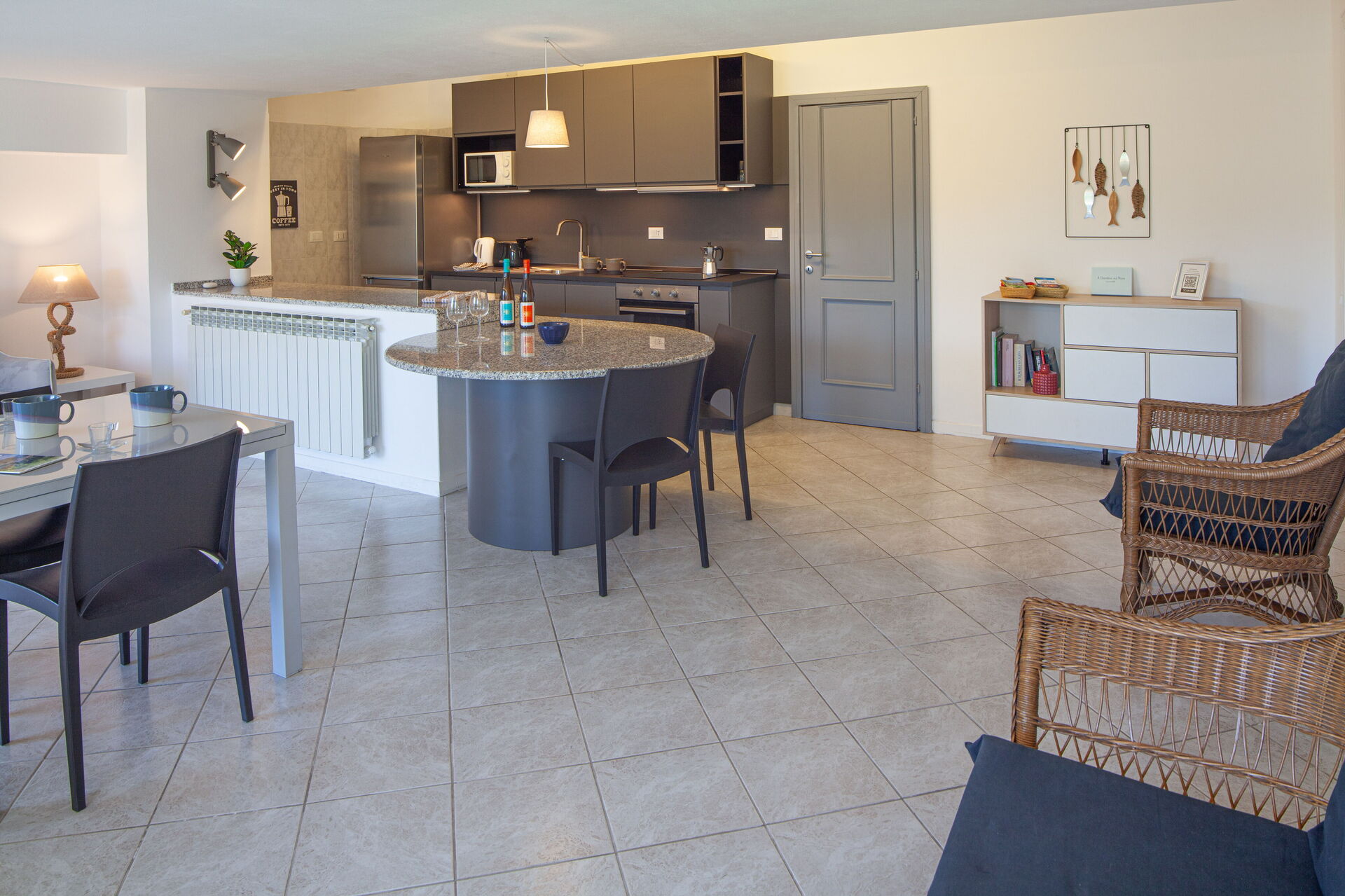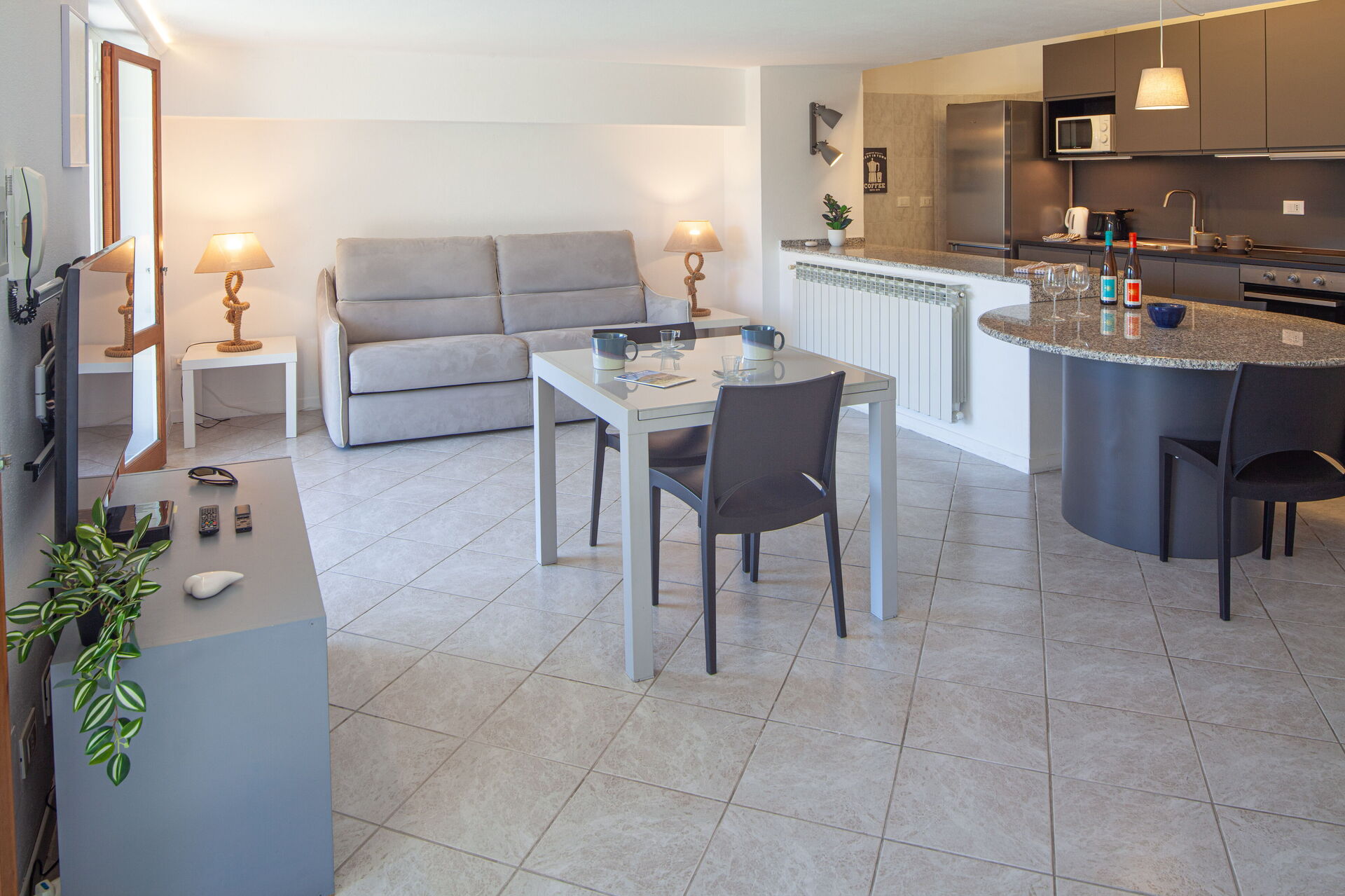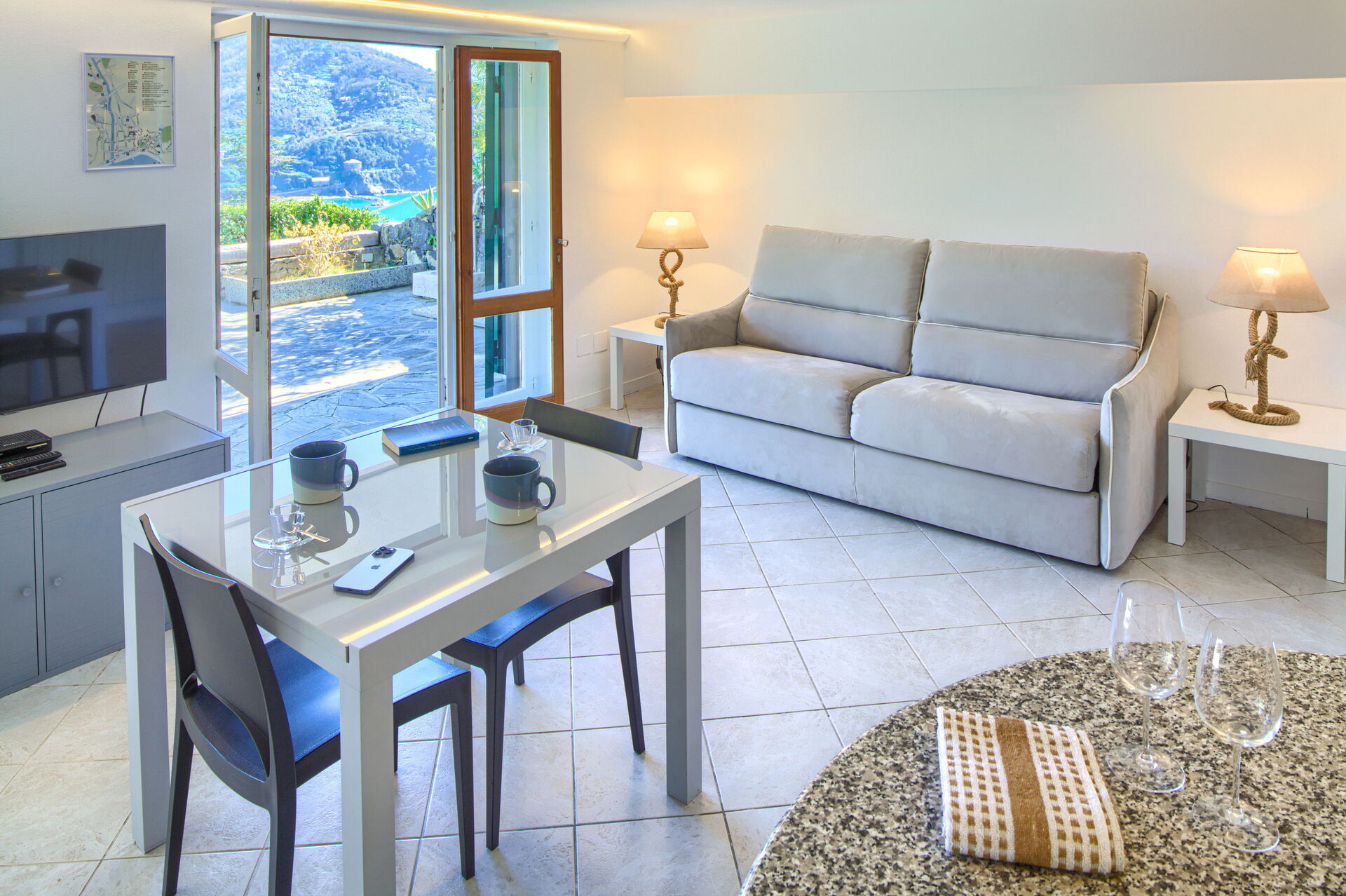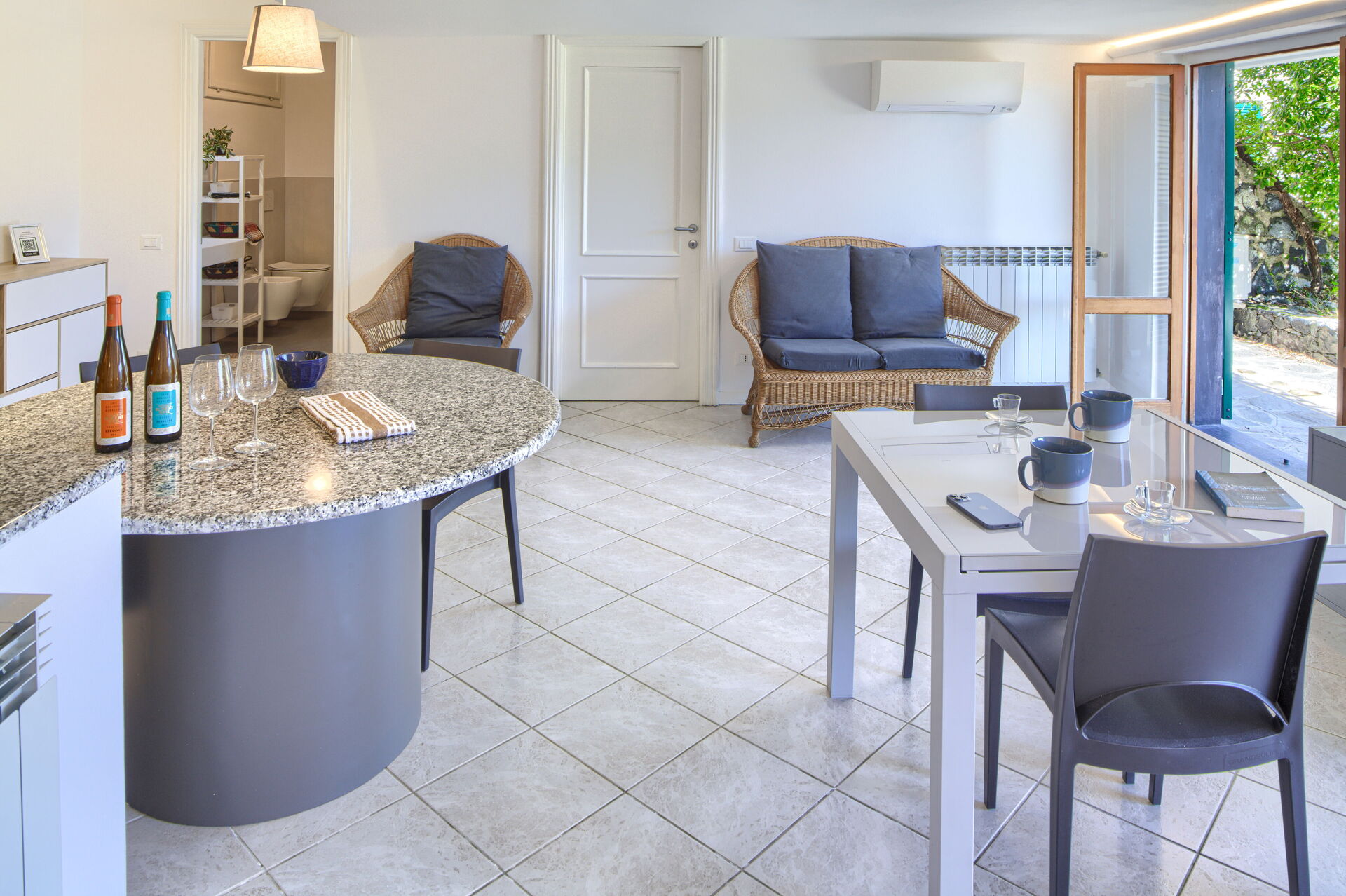 The external area has garden furniture, table with chairs and a little sofa, to enjoy breakfasts or dinners outdoors, with a breathtaking view of the sea.