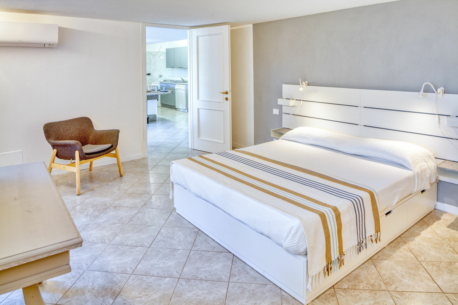The bedroom is large, with a double bed and a single bed.
