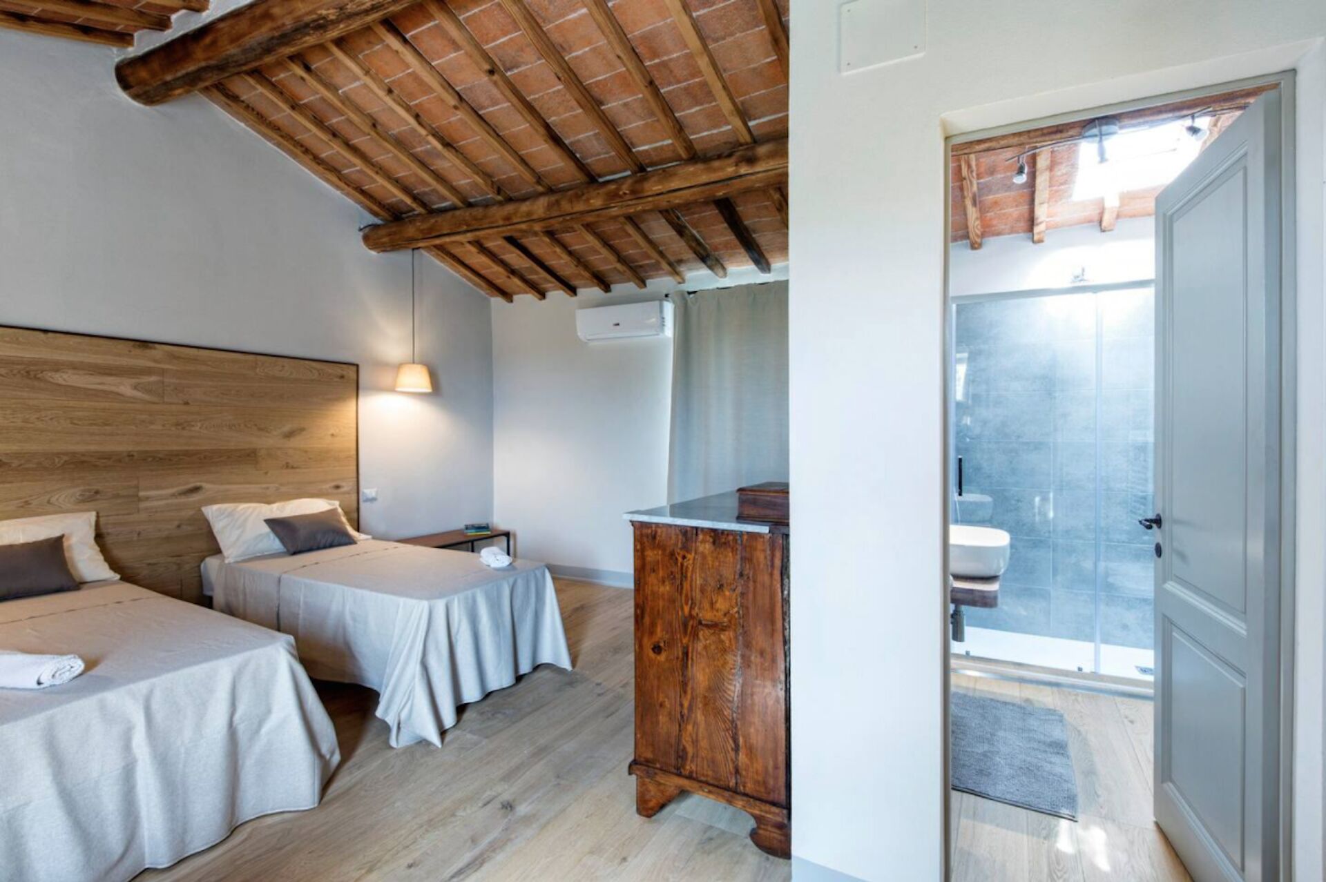 Bedroom + Ensuite Bathroom 1: two single beds (length: 190m, width: 85m), WIFI internet, air conditioning, mosquito net, basin, toilet, bidet, shower, hairdryer.