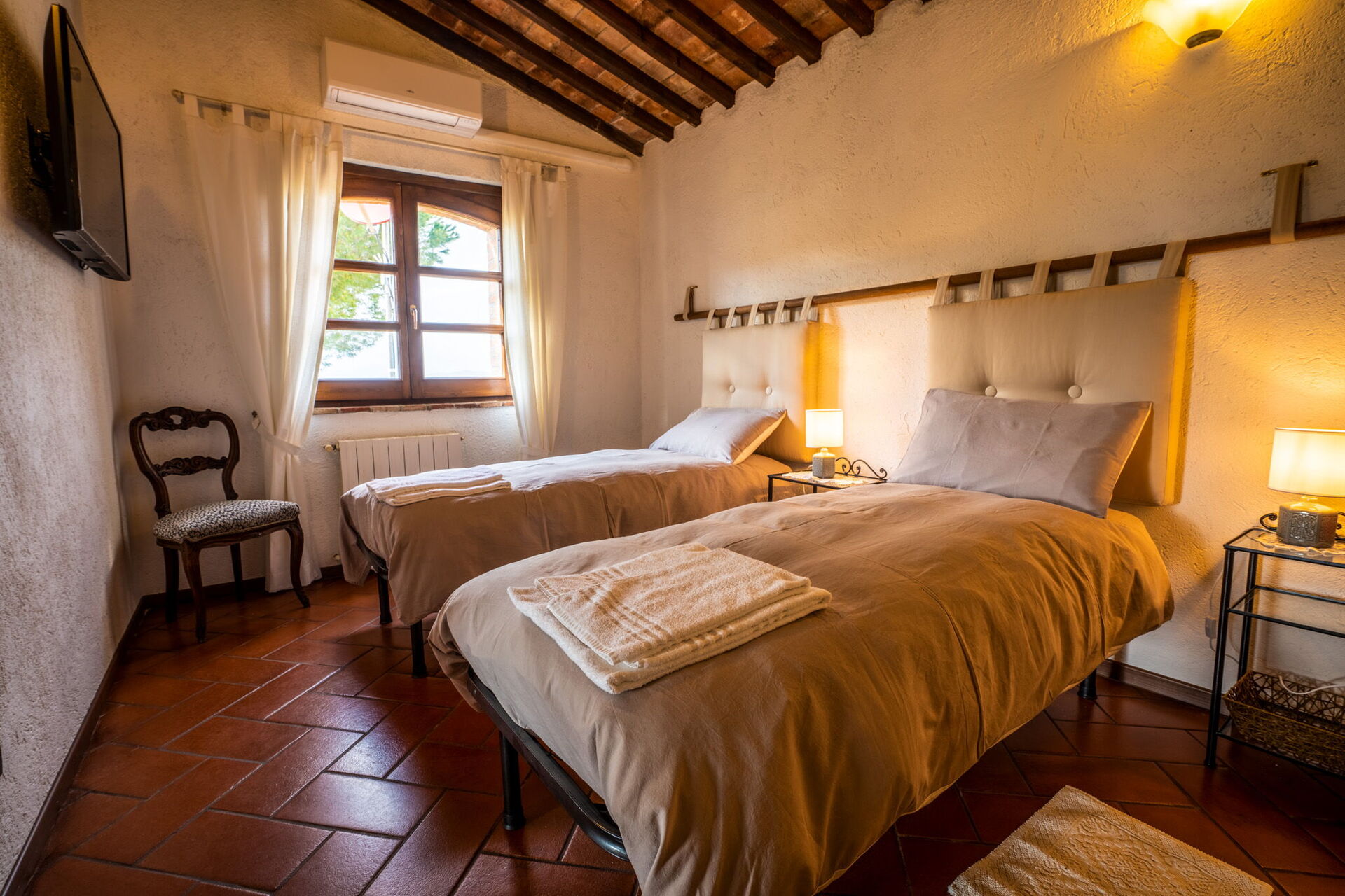 Bedroom (14 m2): two single beds, WIFI internet, air conditioning, mosquito net, satellite tv, working desk.