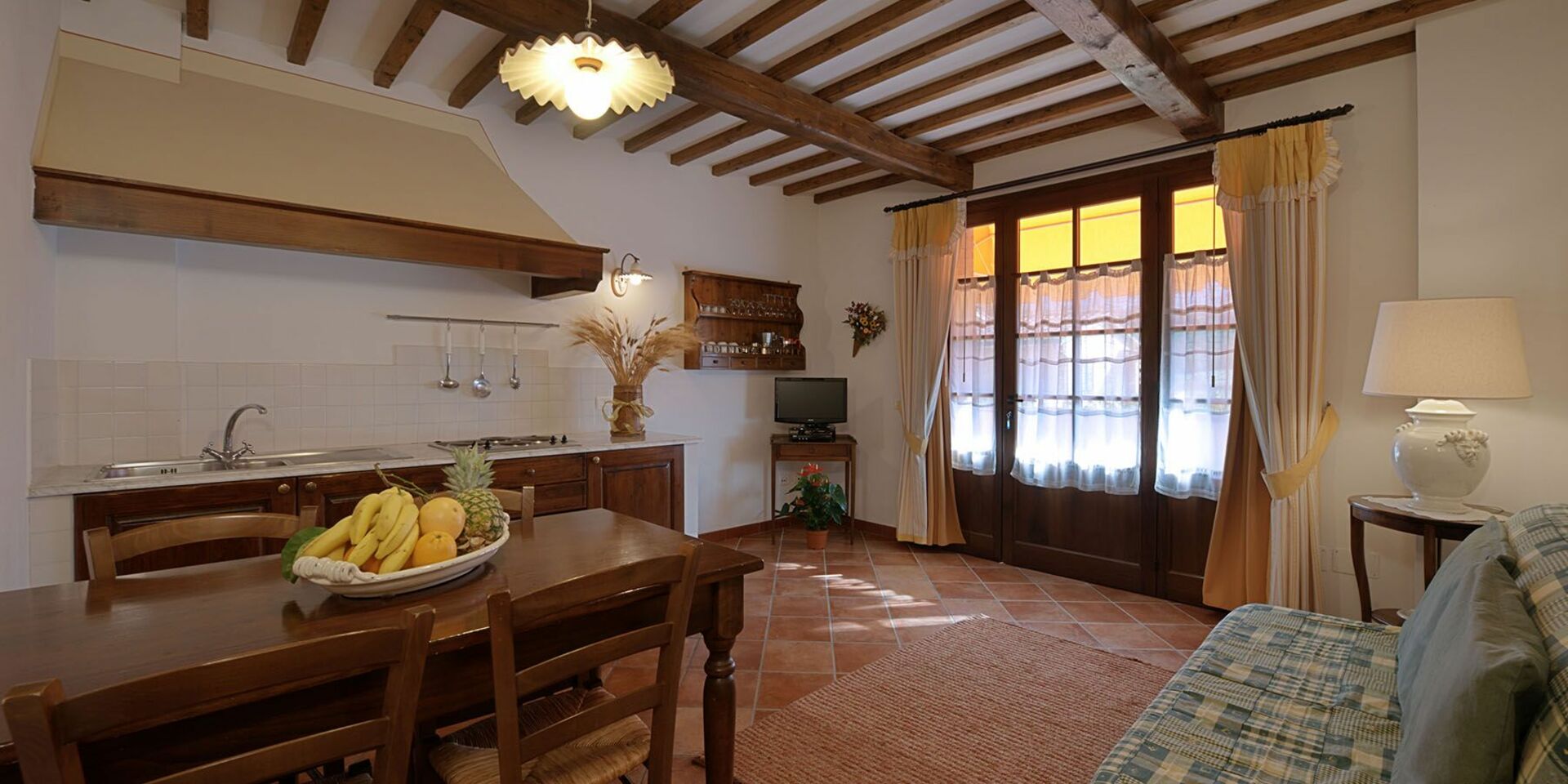 50 m2 First floor: entrance on a living room (TV Sat) with kitchen corner (small oven, freezer) and double sofa bed, bathroom with shower, double bedroom with balcony.
