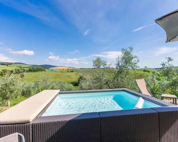 The outdoor spaces at "Campo al Quattrino" reflect the unspoiled natural beauty of the surrounding Tuscan landscape. The shared courtyard serves as a central gathering point for guests, framed by the sweeping views of vineyards and open fields that define this elevated rural setting. The property's position at 400 meters above sea level ensures panoramic vistas and a refreshing breeze throughout the day, making the outdoor areas particularly inviting during the warmer months. The natural state landscapes that encircle the farm create a sense of seclusion and harmony with the environment, ideal for those seeking a genuine connection with the Tuscan countryside.