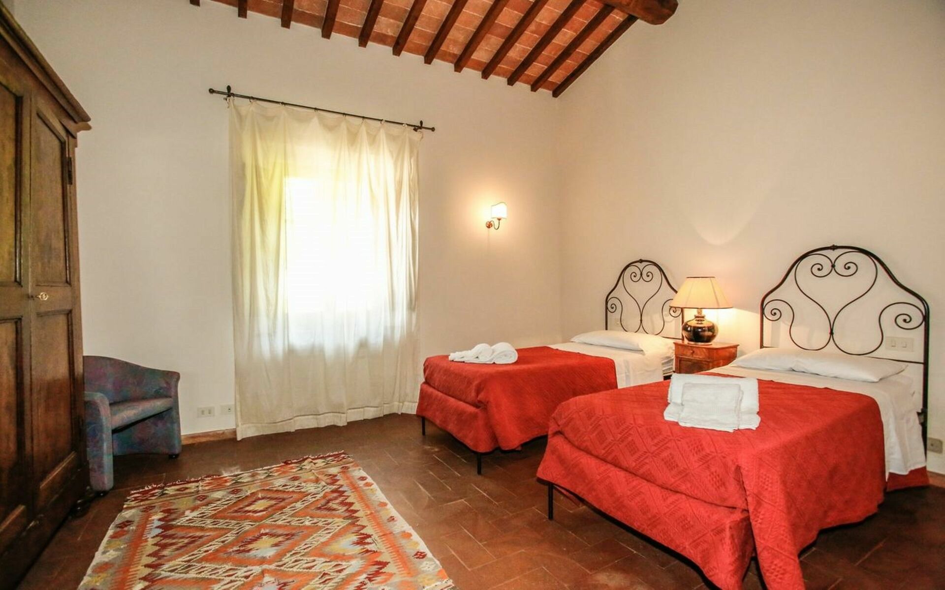 Bedroom 2: air conditioning two single beds, armchair.